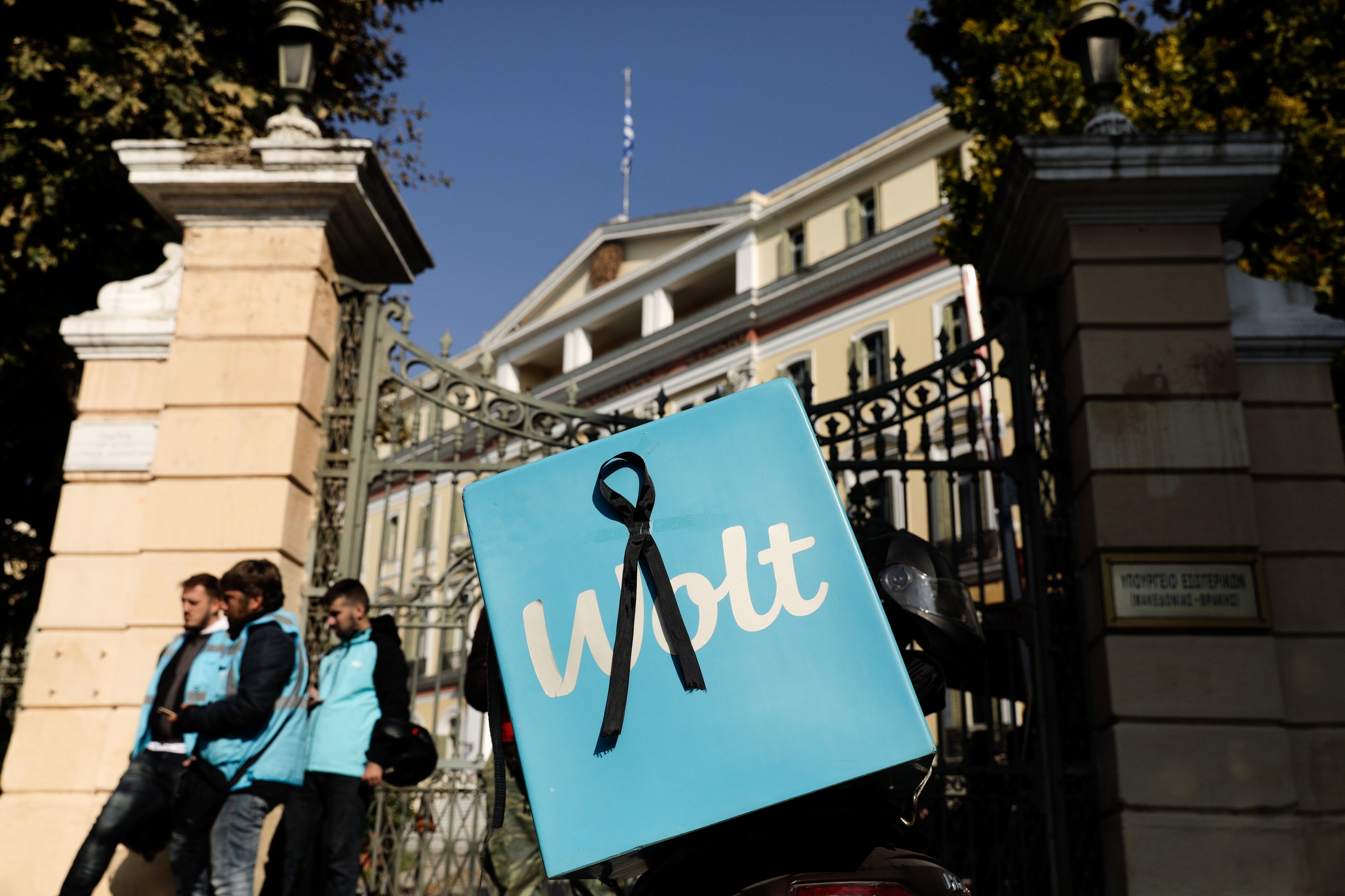 Courier services workers marching in Thessaloniki, on the occasion of the fatal injury of their colleague, November 1, 2021. / Μοτοπορεία διανομέων φαγητού προς το ΥΜΑΘ με αφορμή τον θανάσιμο τραυματισμό συναδέλφου τους, 1 Νοεμβρίου 2021.