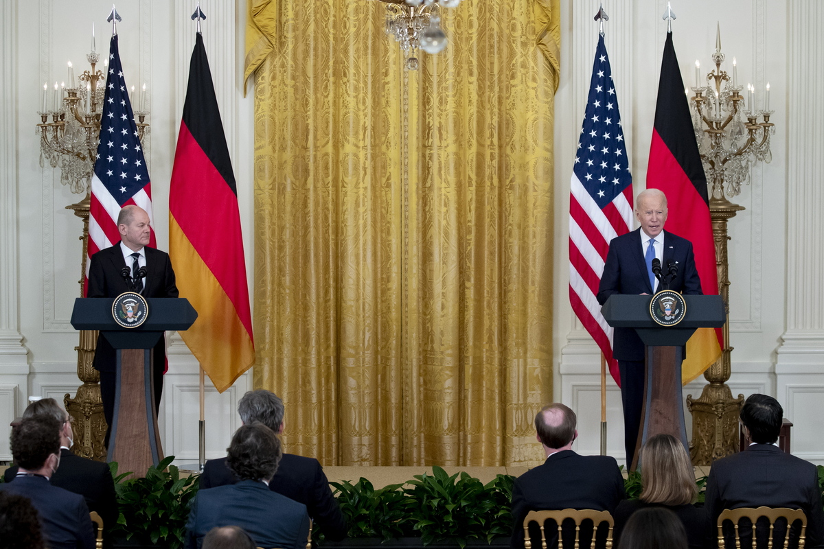 epa09736524 US President Joe Biden (R) and Chancellor of Germany Olaf Scholz hold a joint news conference following an Oval Office bilateral meeting, in the East Room of the White House in Washington, DC, USA, 07 February 2022. Biden hosts Scholz on his first trip to the White House as Chancellor of Germany, to discuss the buildup of Russian forces on the border of Ukraine and other bilateral concerns. EPA/MICHAEL REYNOLDS