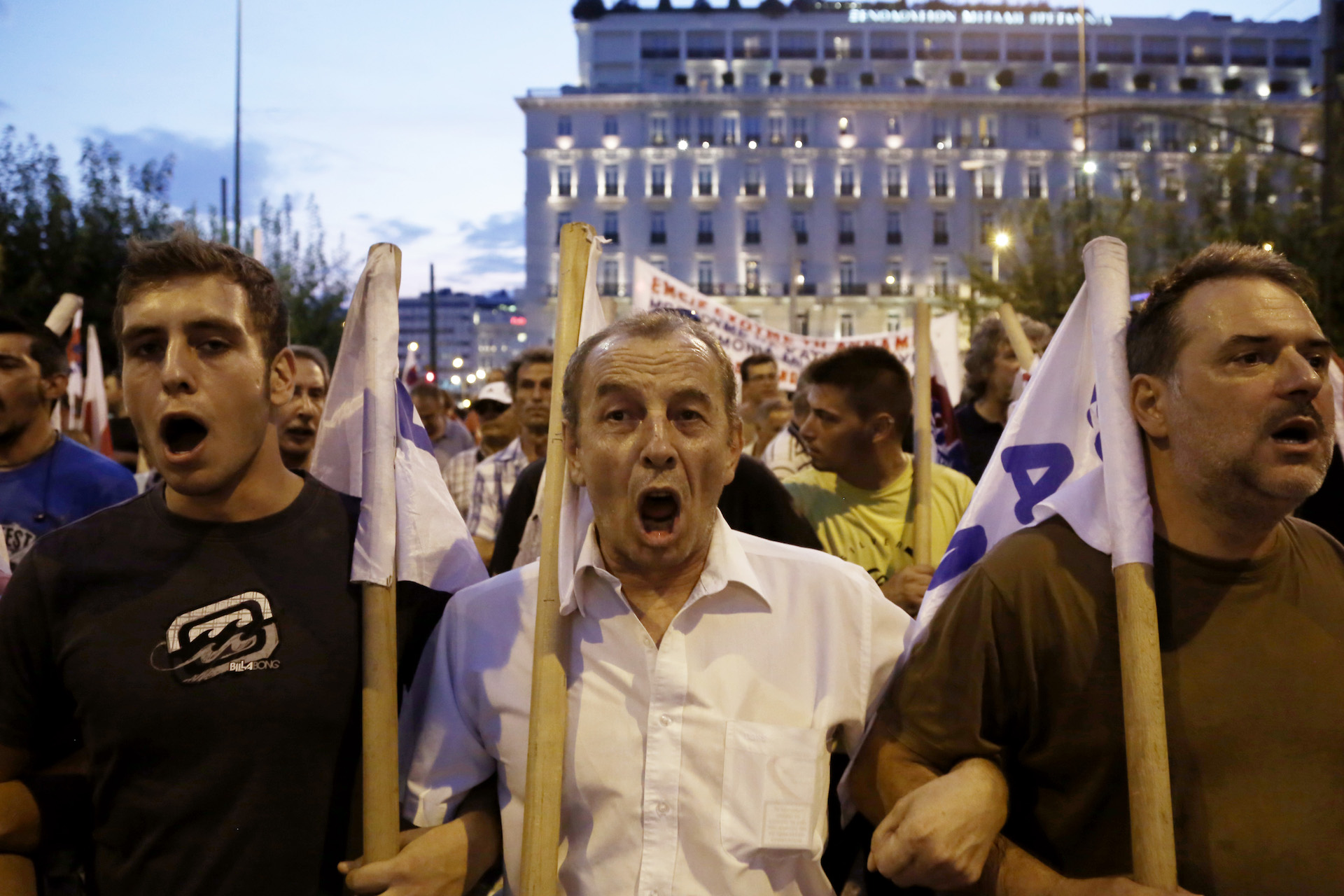 Protest rally in central Athens from public sector union ADEDY and the communist affiliated union PAME, against Greece’s new bailout, during the discussion at the Parliament of the draft law of the new loan agreement. On Thursday, August 13, 2015. / Συγκέντρωση διαμαρτυρίας στην Αθήνα απο την ΑΔΕΔΥ και το ΠΑΜΕ ενάντια στο νέο μνημόνιο κατά την διάρκεια της συζήτησης του νομοσχεδίου στην Βουλή. Πέμπτη 13 Αυγούστου 2015