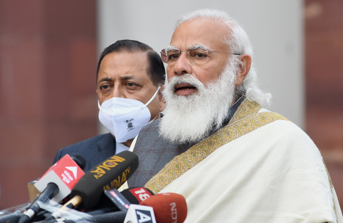 epa08972360 Indian Prime Minister Narendra Modi (R) speaks to members of the media at the beginning of the budget session of the Indian Parliament in New Delhi, India, 29 January 2021. Modi-led Bhartya Janta Party (BJP) government and Indian finance minister Nirmala Sitharaman will present the union budget on 01 February 2021. EPA/STR