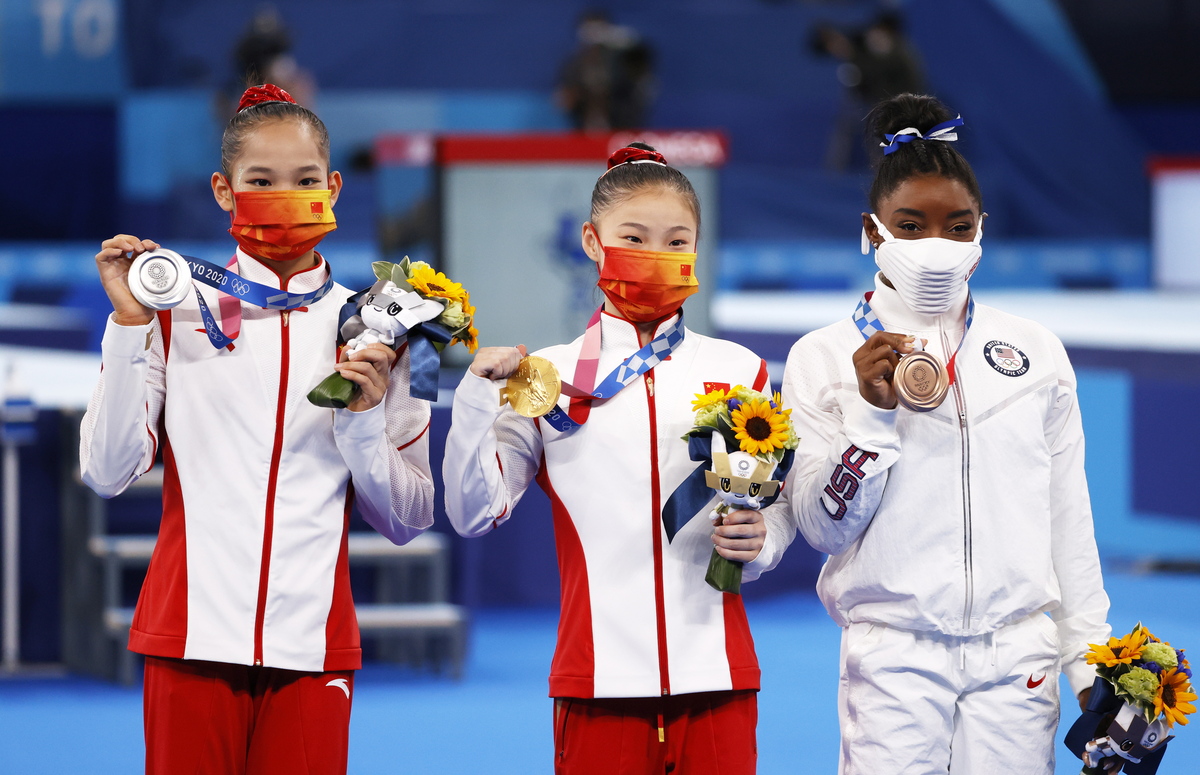 epa09390650 Silver medalist Tang Xijing of China, Gold medalist Guan Chenchen of China and Bronze medalist Simone Biles of USA pose on the podium after the Women's Balance Beam final during the Artistic Gymnastics events of the Tokyo 2020 Olympic Games at the Ariake Gymnastics Centre in Tokyo, Japan, 03 August 2021. EPA/HOW HWEE YOUNG
