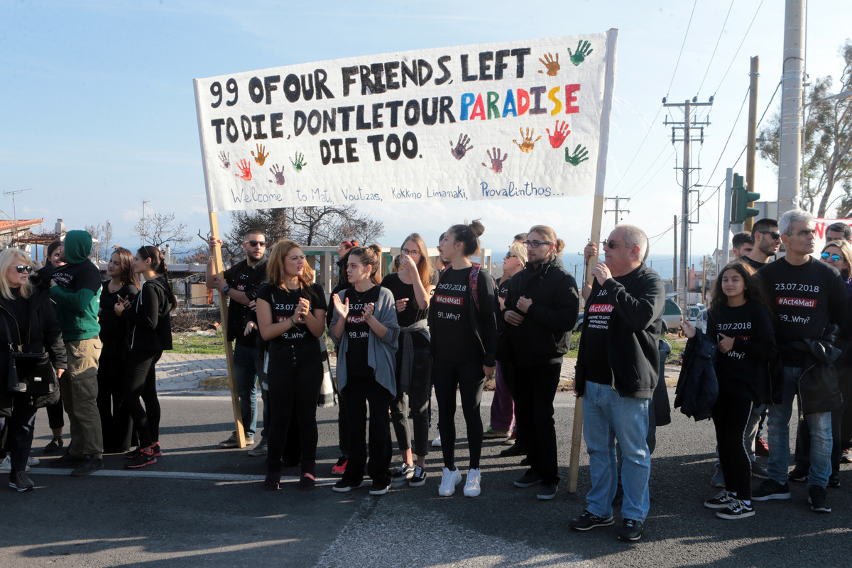 Κάτοικοι των πυρόπληκτων περιοχών της ανατολικής αττικής σχηματίζουν ανθρώπινη αλυσίδα κατά μήκος της Λεωφόρου Μαραθώνος, κατά την ημέρα του 36ου Αυθεντικού Μαραθωνίου ντυμένοι με μαύρα μπλουζάκια που «γράφουν 3.07.2018, # Act4Mati, 99… Why?» , Κυριακή 11 Νοεμβρίου 2018. ΑΠΕ-ΜΠΕ/ ΑΠΕ-ΜΠΕ/ Παντελής Σαΐτας