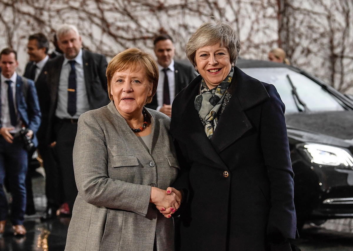 epa07223448 German Chancellor Angela Merkel (R) welcomes British Prime Minister Theresa May (L) at the chancellery in Berlin, Germany, 11 December 2018. British Prime Minister Theresa May postponed the Brexit deal Meaningful Vote, on 11 December 2018 due to risk of rejection from Members of Parliament. Theresa May is currently on a whistle stop tour of Europe calling on the leaders of the Netherlands, Germany and EU in Brussels looking for new guide lines for her Northern Ireland backstop. EPA/FILIP SINGER