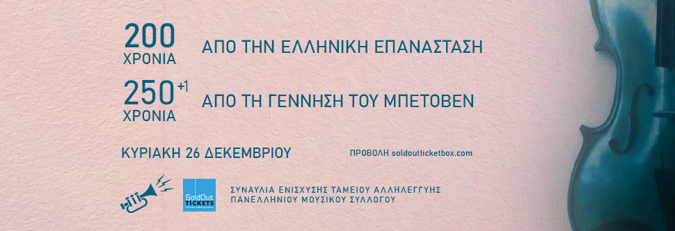 Ο Πανελλήνιος Μουσικός Σύλλογος διοργανώνει συναυλία αφιέρωμα στα 250+1 χρόνια από τη γέννηση του L.V. Beethoven και στα 200 χρόνια από την Ελληνική Επανάσταση. Μια παραγωγή που έχει σκοπό την ενίσχυση του ταμείου αλληλεγγύης του Συλλόγου, ένα ταμείο που στήριξε και στηρίζει όσους μουσικούς έχουν ανάγκη σε αυτές τις δύσκολες στιγμές που περνά ο κλάδος μας.