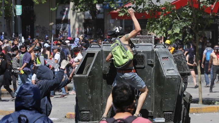 Εξάλλου οι διαδηλώσεις στο Σαντιάγο αμαυρώθηκαν από πολλά επεισόδια. Συγκρούσεις ξέσπασαν μεταξύ των δυνάμεων ασφαλείας και διαδηλωτών, ενώ πολλά λεωφορεία πυρπολήθηκαν. Την ώρα που πορεία προσπαθούσε να φτάσει στο προεδρικό μέγαρο η αστυνομία αποπειράθηκε να διαλύσει το πλήθος κάνοντας χρήση αντλιών νερού και δακρυγόνων. Τουλάχιστον μία αστυνομικός τραυματίστηκε, σύμφωνα με φωτογράφο του AFP, ο οποίος τράβηξε φωτογραφία το φλεγόμενο κράνος της.