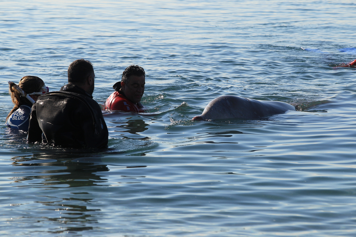 Δύτες προσπαθούν να βοηθήσουν τραυματισμένη μικρή φάλαινα που έχει βγει στην παραλία του Αλίμου, Παρασκευή 28 Ιανουαρίου 2022.Στο σημείο έχουν μεταβεί στελέχη του Λιμενικού Σώματος, σκάφος του Λιμενικού και δύτες, ενώ αναμένονται και στελέχη του ερευνητικού κέντρου διάσωσης κητωδών ΑΡΙΩΝ προκειμένου να μπορέσουν να δώσουν τις πρώτες βοήθειες στο άτυχο ζώο.Το ακίνδυνο θηλαστικό πιθανόν έχασε τον προσανατολισμό του και βρέθηκε στο συγκεκριμένο σημείο. ΑΠΕ-ΜΠΕ/ΑΠΕ-ΜΠΕ/ΑΛΕΞΑΝΔΡΟΣ ΒΛΑΧΟΣ