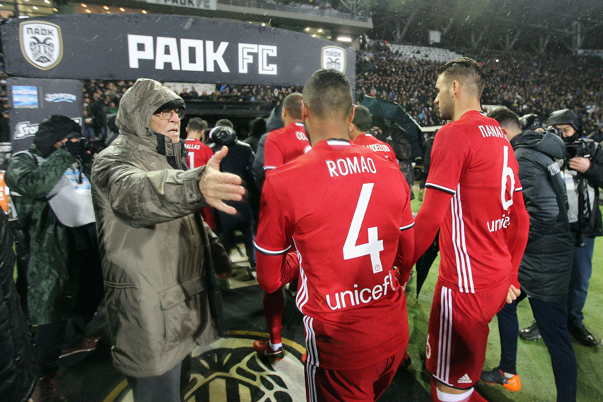 Οι παίκτες του Ολυμπιακού αποχωρούν από τον αγωνιστικό χώρο μετά την διακοπή του αγώνα, ύστερα από τον τραυματισμό του προπονητή του Ολυμπιακού Οσκαρ Γκαρθία με ρολό χαρτιού που δέχτηκε στο κεφάλι, πριν την έναρξη του αγώνα ΠΑΟΚ – Ολυμπιακός για την 23η αγωνιστική του πρωταθλήματος SuperLeague στο γήπεδο της Τούμπας. Θεσσαλονίκη, Κυριακή 25 Φεβρουαρίου 2018. ΑΠΕ ΜΠΕ/PIXEL/ΜΠΑΡΜΠΑΡΟΥΣΗΣ ΣΩΤΗΡΗΣ