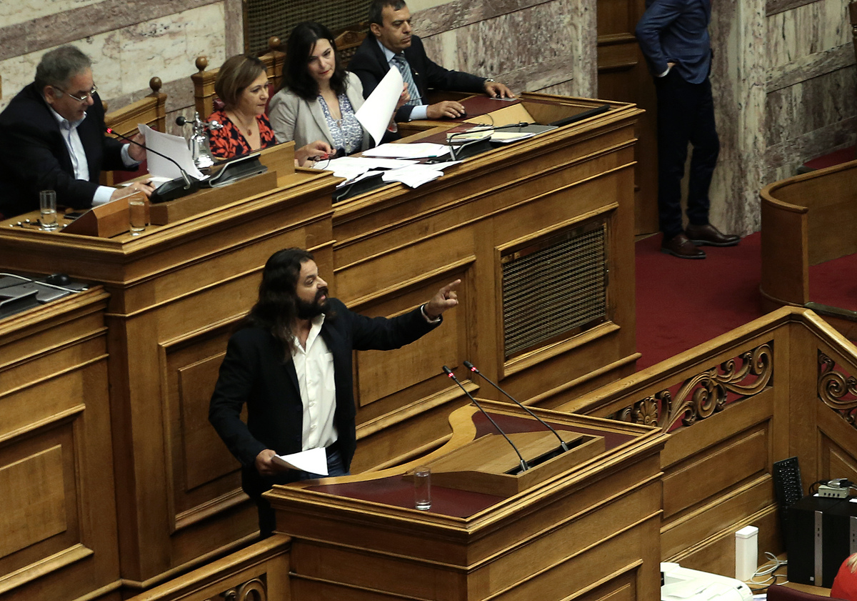 Ο βουλευτής της Χρυσής Αυγής Κώστας Μπαρμπαρούσης διαπληκτίζεται με βουλευτές στη συζήτηση επί της πρότασης δυσπιστίας της ΝΔ κατά της Κυβέρνησης στην Ολομέλεια της Βουλής, Αθήνα, Παρασκευή 15 Ιουνίου 2018. Συγκαλούνται άμεσα τα αρμόδια όργανα της Βουλής με εισήγηση, την αποβολή της Χρυσής Αυγής από τη συζήτηση της πρότασης δυσπιστίας, μετά από ανοιχτή προτροπή του βουλευτή της, Κ. Μπαρμπαρούση να συλλάβει ο στρατός τον Πρόεδρο της Δημοκρατίας, τον Πρωθυπουργό και τον αρχηγό των ΑΝΕΛ. ΑΠΕ-ΜΠΕ/ΑΠΕ-ΜΠΕ/ΣΥΜΕΛΑ ΠΑΝΤΖΑΡΤΖΗ