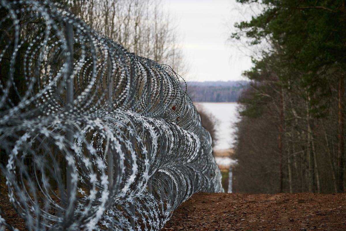 epa09587840 A handout photo made available by Latvian Prime Minister's office shows barbed wire fence between Latvia and Belarus during Latvia's Prime Minister Krisjanis Karis' (not seen) unannounced visit to Latvian and Belarus border in Silene, Latvia, 17 November 2021. Krisjanis Karins met the border guards and soldiers of the National Armed Forces, who are currently guarding the Latvian-Belarusian border. EPA/LATVIAN PRIME MINISTER OFFICE HANDOUT HANDOUT EDITORIAL USE ONLY/NO SALES