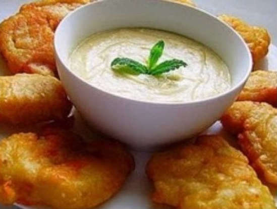 Μπακαλιάρο, 1 κουτάκι μπύρα, 1 αλεύρι για όλες τις χρήσεις, 2 σκελίδες σκόρδο, 2 φέτες ψωμί, 2 κουταλιές της σούπας ελαιόλαδο, αλάτι, πιπέρι και 1 κουταλάκι του γλυκού ξύδι.