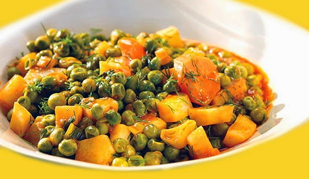 1 πακέτο αρακά, 1 τριμμένο κρεμμύδι, 2 καρότα κομμένα, 2 πατάτες κομμένες, 1 ματσάκι άνηθο, ντοματοπελτέ, ελαιόλαδο, ζάχαρη, αλάτι και πιπέρι.
