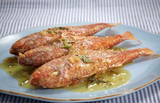 6 μπαρμπούνια μεγάλα, χυμό από 1 λεμόνι, 1 κουταλιά της σούπας μουστάρδα, 1 σφηνάκι ούζο, 1 σκελίδα σκόρδο κομμένη στα δύο, 1/2 φλιτζάνι ελαιόλαδο, δεντρολίβανο, αλάτι και πιπέρι