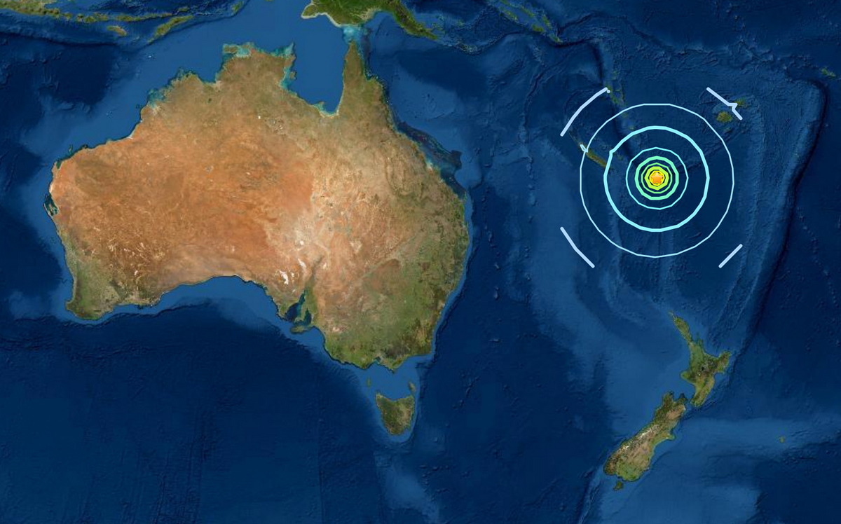 epa09001638 A handout illustration made available by the United States Geological Survey, USGS, showing a graphic illustration of the location of a 7.7-magnitude earthquake that struck in the South Pacific, not far from Australia and New Zealand, late 10 February 2021. The US Geological Survey said the quake at a depth of 10 kilometeres triggered a tsunami warning for New Zealand. EPA/USGS HANDOUT HANDOUT EDITORIAL USE ONLY/NO SALES