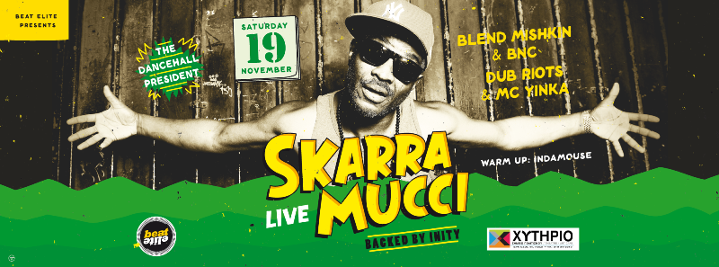 Ο πρόεδρος έρχεται και είναι έτοιμος να εφαρμόσει πλήρως τις προγραμματικές του δηλώσεις, προσφέρoντας απλόχερα και γενναιόδωρα σύγχρονη dancehall και reggae του μέλλοντος. Ο Skarra Mucci, αυτή η ασυγκράτητη reggae δύναμη που σαρώνει στο πέρασμα της τα πάντα έρχεται για πρώτη φορά στη χώρα μας το Σάββατο 19 Νοεμβρίου στο Χυτήριο και μάλιστα με ολοκαίνουργιο album με τίτλο «Dancehall President».