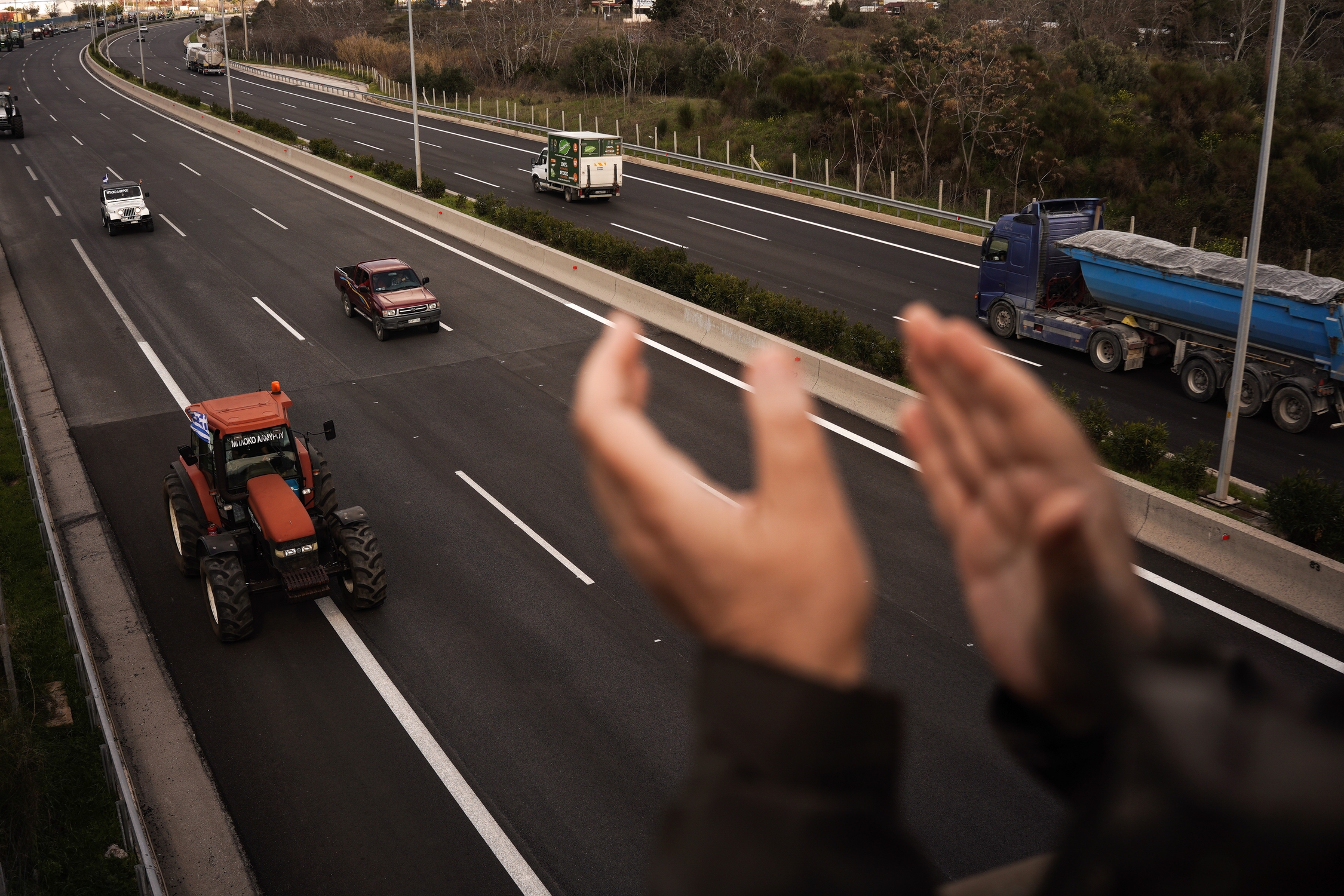 Supporters look at the tractors traveling towards the city during a protest by Greek farmers in Athens, Greece, on February 20, 2024. / Υποστηρικτής κρατάει ενα πυρσό καθώς αγροτικά οχήματα και τρακτέρ κατευθύνονται προς την Αθήνα στα πλαίσια αγροτικού συλλαλητηρίου στην πλατεία Συντάγματος, Αφίδνες 20 Φεβρουαρίου 2024.