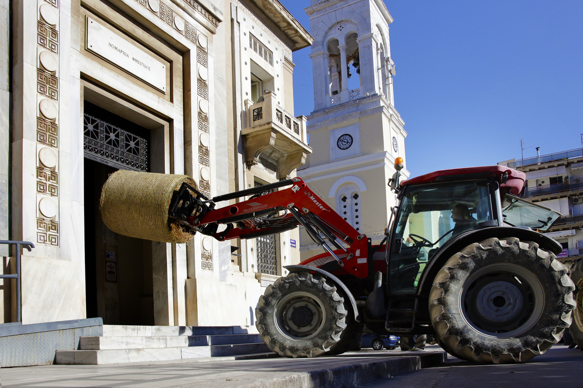 Αγρότες ρίχνουν μπάλα από άχυρο στην είσοδο του κτιρίου της ΠΕ Φθιώτιδας κατά τη διάρκεια διαμαρτυρίας, Λαμία, Παρασκευή 26 Ιανουαρίου 2024. Φορείς και αγροτικοί σύλλογοι από όλη τη Φθιώτιδα συγκεντρώθηκαν έξω από την Πανελλήνια Έκθεση Λαμίας και στη συνέχεια πραγματοποίησαν πορεία διαμαρτυρίας, με 100 περίπου τρακτέρ, στο κέντρο της πόλης. Μετά την πορεία, αντιπροσωπεία αγροτών συνάντησε τον Περιφερειάρχη Στερεάς Ελλάδας Φάνη Σπανό ενώ λίγο νωρίτερα στην είσοδο του κτιρίου της ΠΕ Φθιώτιδας αγρότες έριξαν μπάλα από άχυρο. ΑΠΕ-ΜΠΕ/ΑΠΕ-ΜΠΕ/ΑΡΗΣ ΜΑΡΤΑΚΟΣ