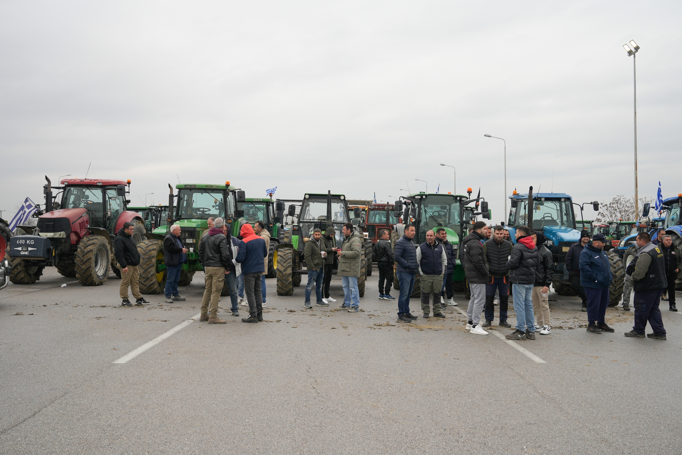 Protesting farmers, together with open-air market workers and taxi drivers, block the Athens-Thessaloniki National Highway, in the direction of Athens 25km southwest of Thessaloniki, Greece on December 3, 2025. / Διαμαρτυρόμενοι αγρότες, μαζί με εργαζόμενους σε λαϊκές αγορές και οδηγούς ταξί, κλείνουν την Εθνική Οδό Αθηνών - Θεσσαλονίκης, στο ρεύμα προς Αθήνα λίγο πριν τα διόδια των Μαλγάρων, με τα τρακτέρ και τα οχήματα τουςπαραταγμένα επι της Εθνικής Οδού, Μάλγαρα, 3 Δεκεμβρίου, 2025