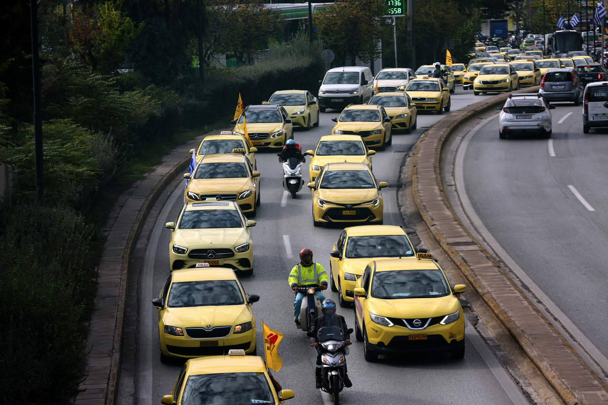 Οδηγοί ταξί με τα οχήματά τους πραγματοποιούν πορεία διαμαρτυρίας προς το υπουργείο Υποδομών και Μεταφορών, ενώ συμμετέχουν από σήμερα σε 48ωρη απεργία του κλάδου, Αθήνα, Τετάρτη 05 Νοεμβρίου 2025. Οι επαγγελματίες οδηγοί ζητούν ελεύθερη διέλευση στις λεωφορειολωρίδες, αλλαγές στην πολιτική για την ηλεκτροκίνηση και άμεση απόφαση παράτασης της υποχρεωτικής ταξινόμησης αμιγώς ηλεκτρικών ταξί και μεταφορά της υποχρέωσης για το 2035. ΑΠΕ-ΜΠΕ/ΑΠΕ-ΜΠΕ/Αλέξανδρος Μπελτές