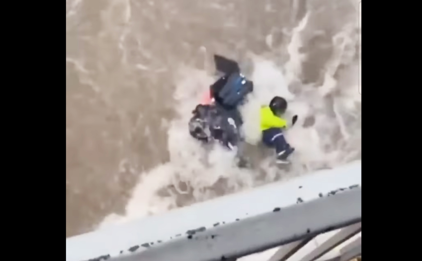 Πιο συγκεκριμένα, όπως φαίνεται στο βίντεο που αναπαράγεται στα social media, ένας διανομέας στην προσπάθειά του να διασχίσει έναν δρόμο στο κέντρο της πόλης που είχε μετατραπεί σε ποτάμι, παρασύρθηκε από τα ορμητικά νερά.