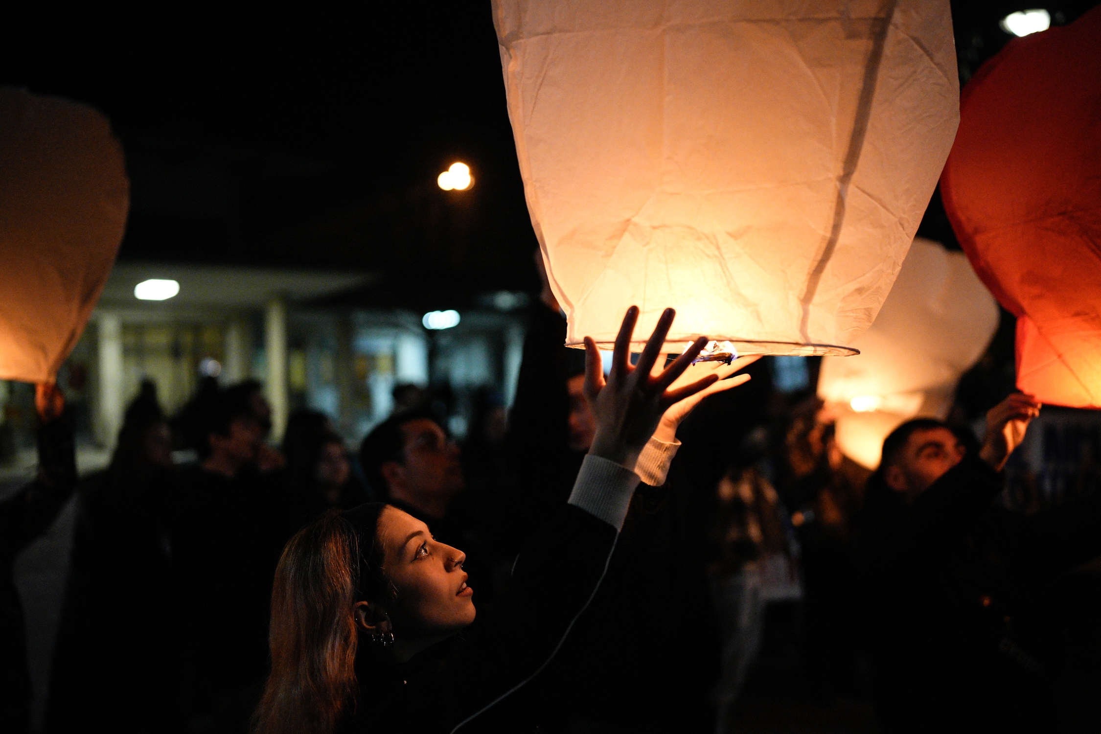 Συγκέντρωση μνήμης μαθητών και φοιτητών έξω από τον σιδηροδρομικό σταθμό Λάρισας με αφορμή την επέτειο από το σιδηροδρομικό δυστύχημα στα Τέμπη, 27 Φεβρουαρίου 2024.