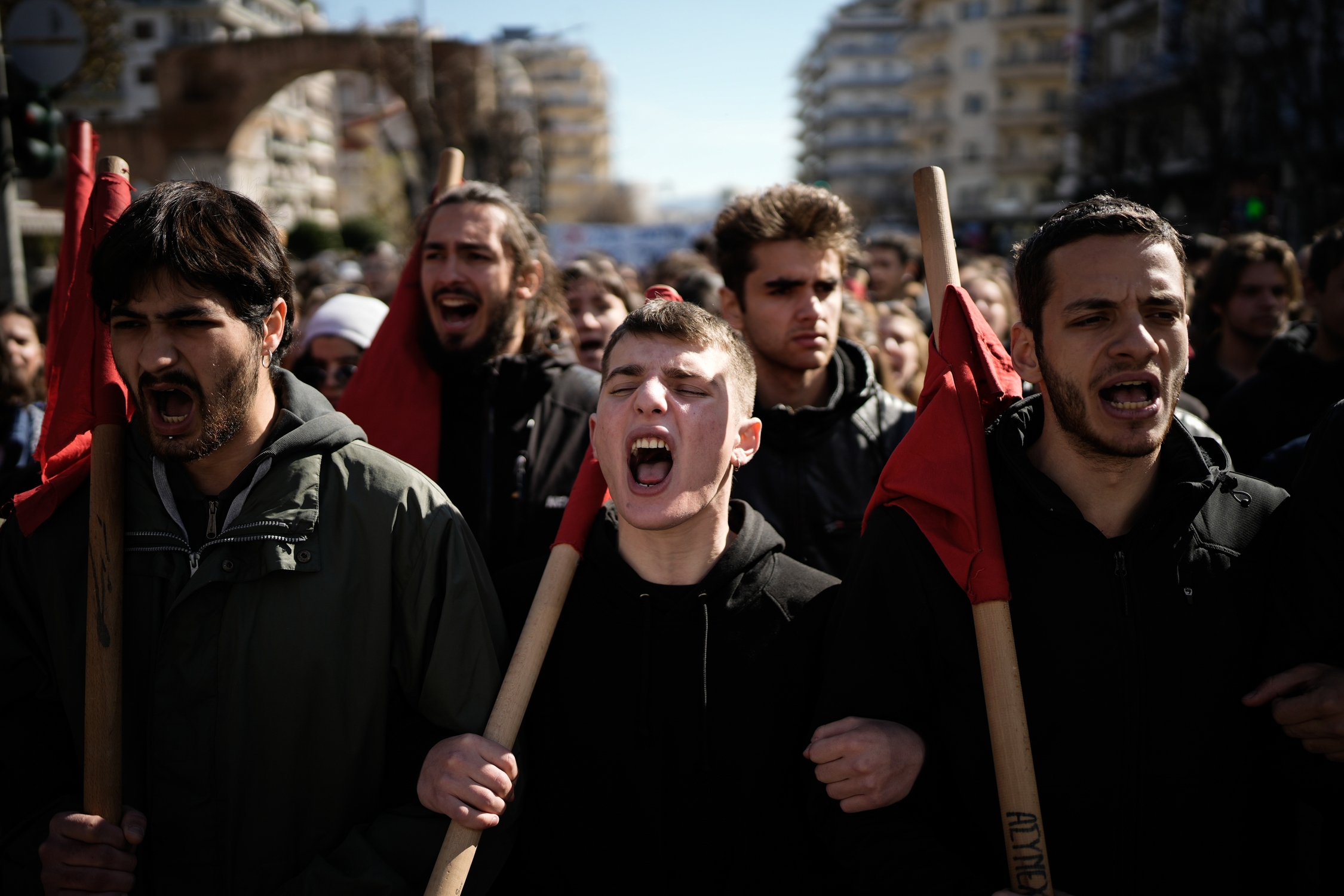 Αφότου έφτασε στο ΥΜΑΘ η πορεία κινήθηκε μέσω των οδών Αγίου Δημητρίου, Ιασωνίδου και Εγνατίας προς τα Πανεπιστήμια. Τότε άτομα με καλυμμένα τα χαρακτηριστικά του προσώπου τους έστησαν οδοφράγματα βάζοντας φωτιά σε κάδους στην Εγνατία Οδό, μπροστά από τη Θεολογική Σχολή και στην Εθνικής Αμύνης μπροστά από τη Φιλοσοφική Σχολή. Στη συνέχεια άρχισαν να αποσπούν πέτρες και μάρμαρα από πεζοδρόμια και χώρους του ΑΠΘ, εκσφενδονίζοντας τα προς τις δυνάμεις της αστυνομίας, οι οποίες τους ακολούθησαν όταν εισήλθαν στο campus και προσπάθησαν να τους απωθήσουν κάνοντας χρήση χημικών.