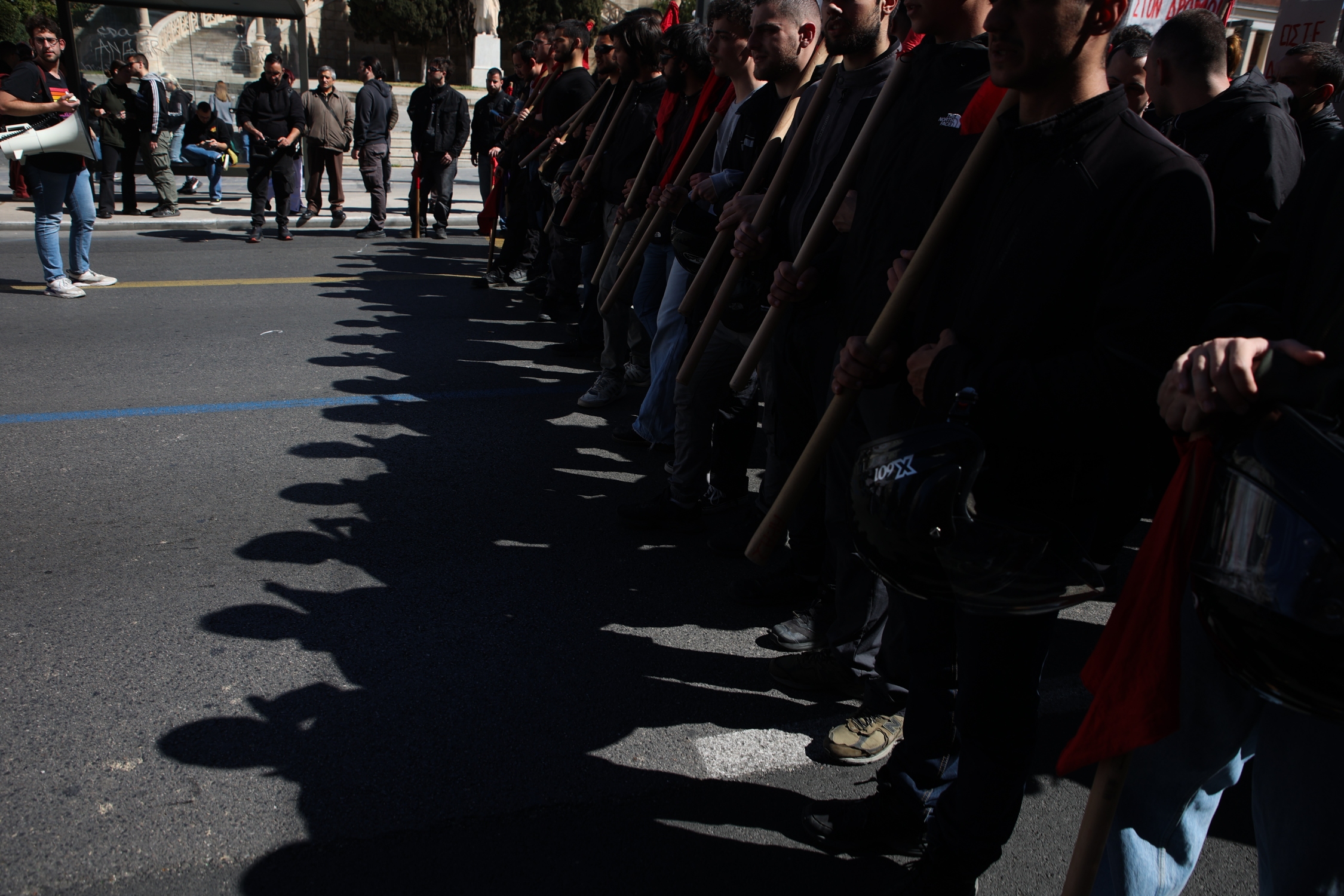 Όταν η πορεία έφτασε μπροστά από το Κοινοβούλιο, φοιτητές κρατώντας χαρτόνια σχημάτισαν σύνθημα «Ή τα κέρδη τους ή οι ζωές μας».