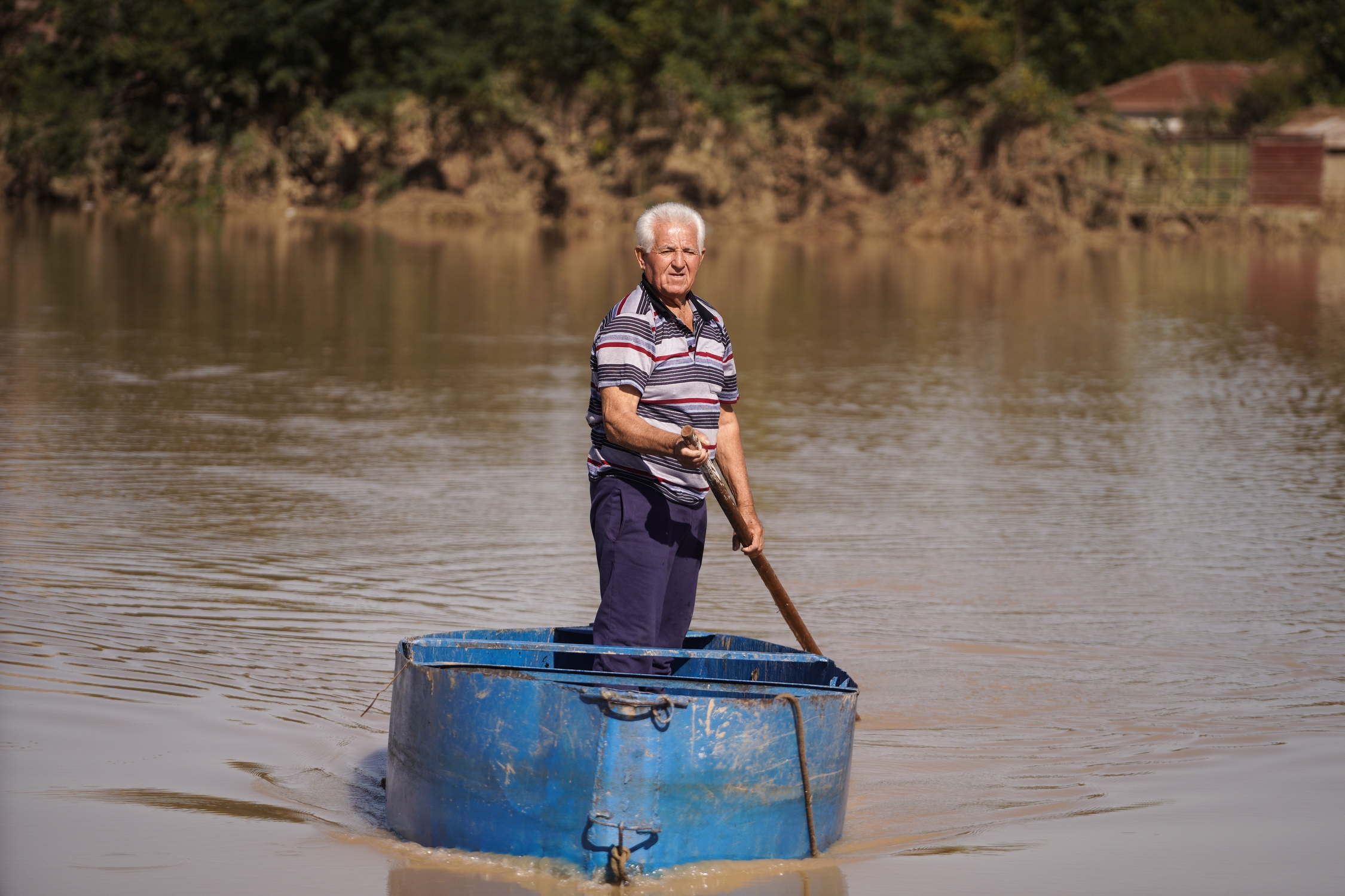Kostas Tatsiopoulos, 80, arrives with his boat in the flooded village of Metamorfosi in Karditsa to carry supplies and medicine to the two residents who remained in the village after the floods caused by the storm Daniel, September 12, 2023. During the flood Mr. Tatsiopoulos rescued 17 people with his boat. / Ο Κώστας έσωσε 17 άτομα με τη βάρκα του από το χωριό Μεταμόρφωση Καρδίτσας κατά την διάρκεια των πλημμυρών που προκάλεσε η κακοκαιρία Daniel, 12 Σεπτεμβρίου 2023.