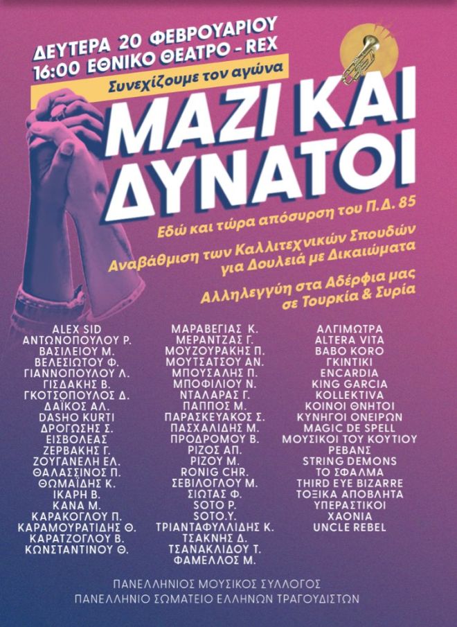 Συναυλία διοργανώνουν για σήμερα Δευτέρα (20/2), ο Πανελλήνιος Μουσικός Σύλλογος και το Πανελλήνιο Σωματείο Ελλήνων Τραγουδιστών – ΠΣΕΤ, στις 16:00 έξω από το υπό κατάληψη Rex, με σύνθημα «Συνεχίζουμε τον αγώνα ΜΑΖΙ ΚΑΙ ΔΥΝΑΤΟΙ».