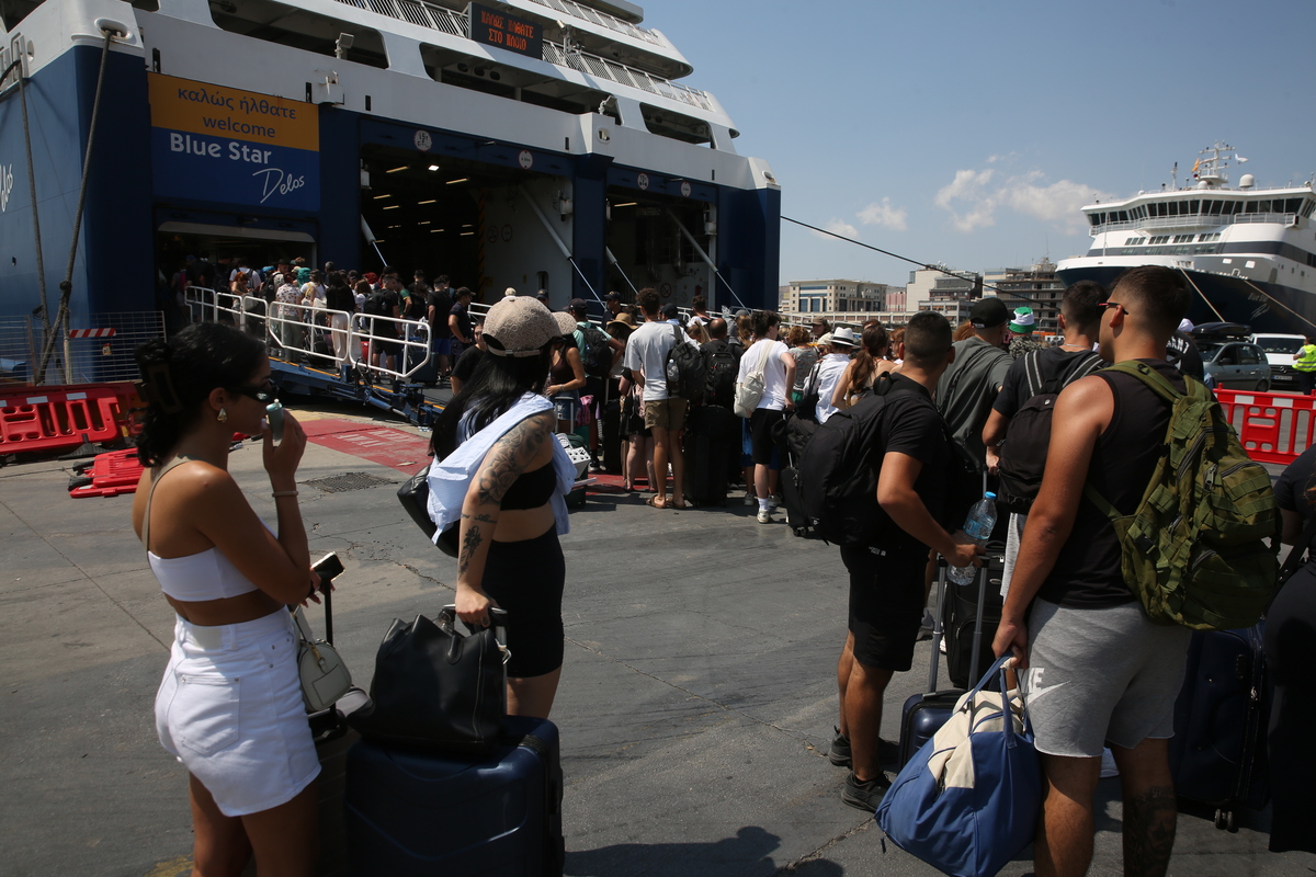 Ταξιδιώτες επιβιβάζονται σε πλοίο όπου θα αναμένουν την αναχώρηση από το λιμάνι του Πειραιά, Παρασκευή 8 Αυγούστου 2025. Τα πλοία είναι δεμένα στα λιμάνια λόγω του απαγορευτικού απόπλου ώστοσο κάποια δρομολογία εκτελούνται με απόφαση των ακτοπλοϊκών εταιρειών, όπως προβλέπεται. Στις 16:00 αναμένεται να αναχωρήσουν τα πλοία προς Κυκλάδες από το λιμάνι του Πειραιά. ΑΠΕ-ΜΠΕ/ΑΠΕ-ΜΠΕ/ΑΛΕΞΑΝΔΡΟΣ ΜΠΕΛΤΕΣ