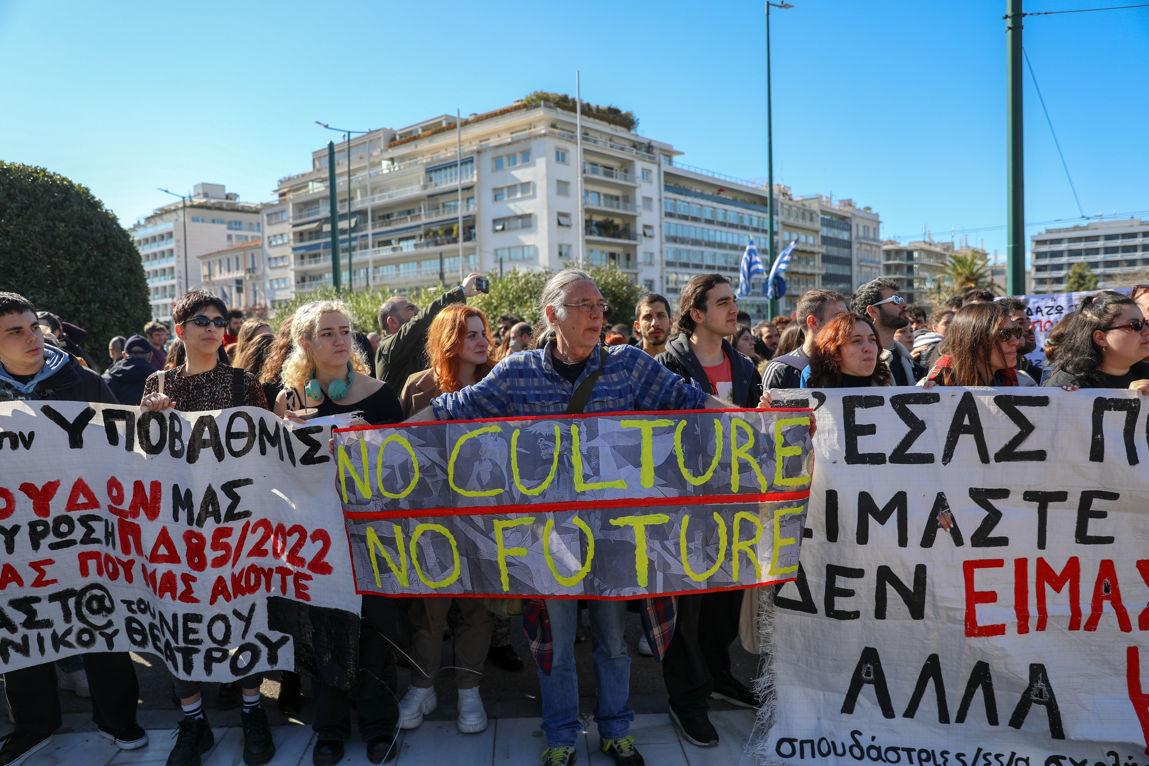 Χιλιάδες κόσμου βρέθηκαν νωρίτερα στο Σύνταγμα με πανό στα χέρια, με κύριο αίτημα την απόσυρση του Προεδρικού Διατάγματος 85/2022 και την υπαγωγή όλων των καλλιτεχνών στη μισθολογική βαθμίδα ΤΕ. Η ΠΟΘΑ (Πανελλήνια Ομοσπονδία Θεάματος Ακροάματος) είχε ανακοινώσει διήμερη απεργία και συγκέντρωση διαμαρτυρίας για σήμερα Πέμπτη (02/02) στο Σύνταγμα.