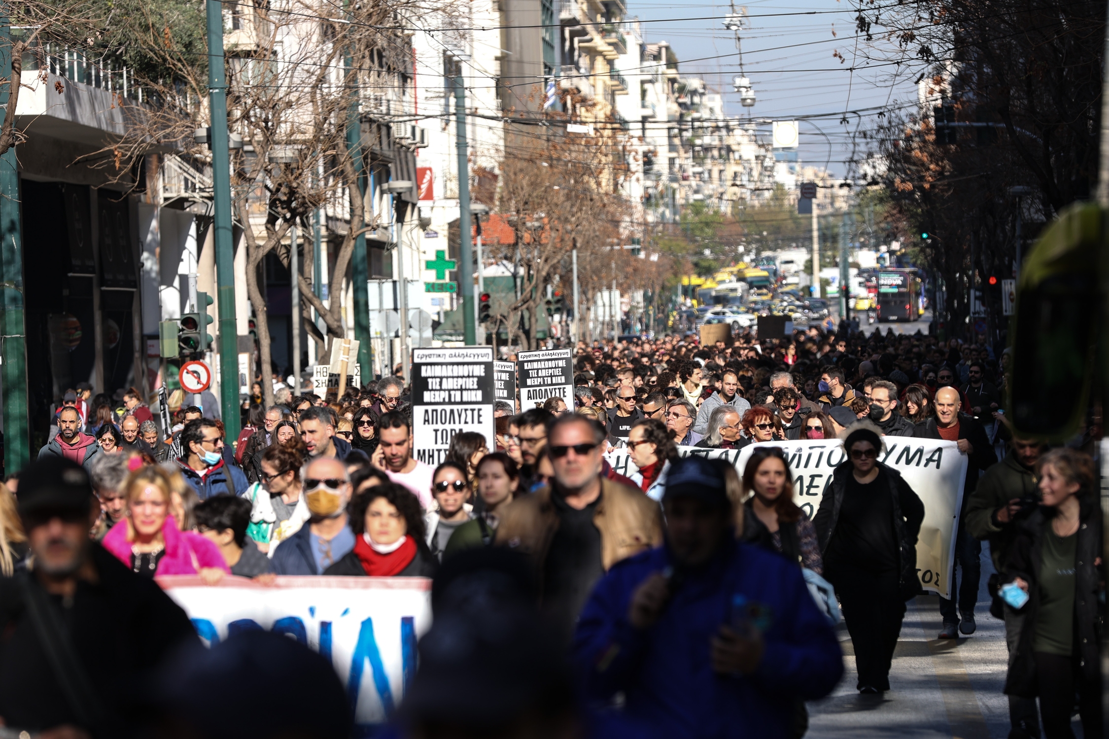 Συγκέντρωση στο υπουργείο πολιτισμού και πορεία διαμαρτυρίας ηθοποιών κατά τηςυποβάθμισης του πτυχίου των δραματικών σχολών, στην Αθήνα, στις 27 Δεκεμβρίου, 2022