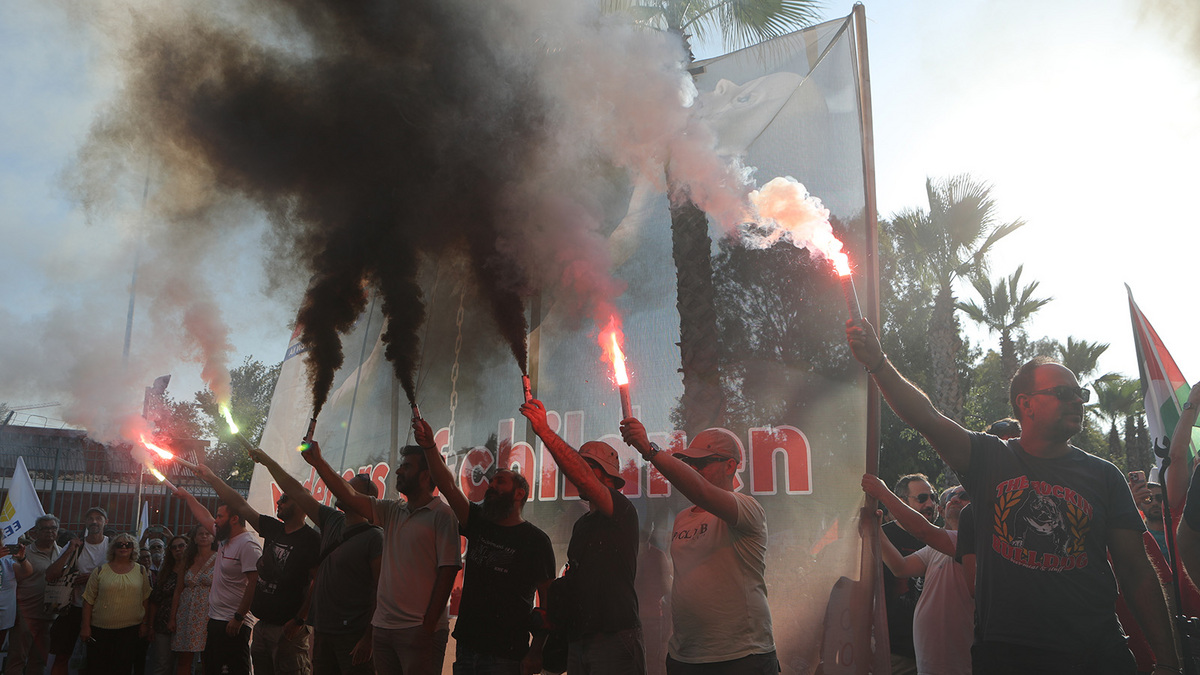 Επίσης αντιπροσωπεία συνδικάτων άνοιξε πανό με το σύνθημα «Λευτεριά στην Παλαιστίνη» και μέσα στο λιμάνι, ενώ με γιγαντοπανό σε πεζογέφυρα του Πειραιά και με τρικάκια που πέταξαν την ώρα που μεταφέρονταν το κομβόι με τα πούλμαν με επιβάτες και στρατιώτες των IDF τα Εργατικά Σωματεία και το ΠΑΜΕ έδειξαν πως «η Ελλάδα δεν θα γίνει χώρα ανάπαυσης για εγκληματίες πολέμου που εκτελούν παιδιά».