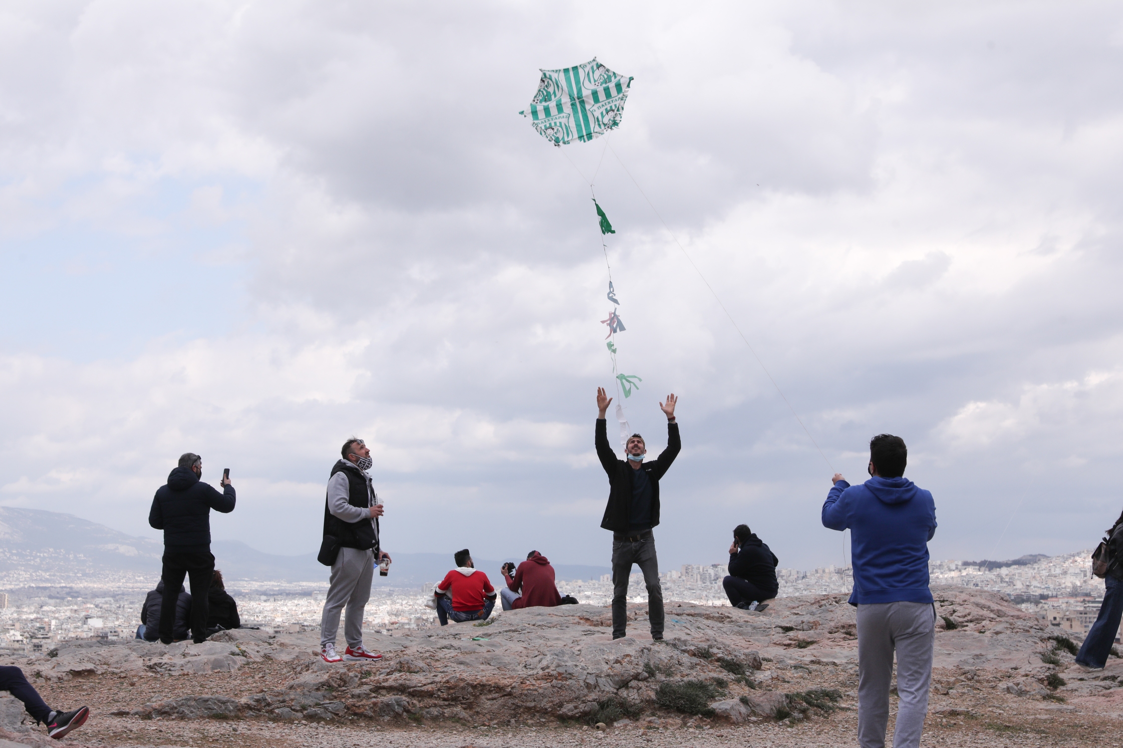 People fly kites at Filopappou hill during 'Clean Monday' celebrations in Athens, Greece on March 15, 2021. 'Clean Monday' marks the end of the carnival period and the first day of Great Lent in the Eastern Orthodox Christian church calendar. / Κόσμος πετάει χαρταετό κατά την διάρκεια εορτασμού της Καθαράς Δευτέρας στο λόφο Φιλοπαππου Αθήνα, 15 Μαρτίου 2021.