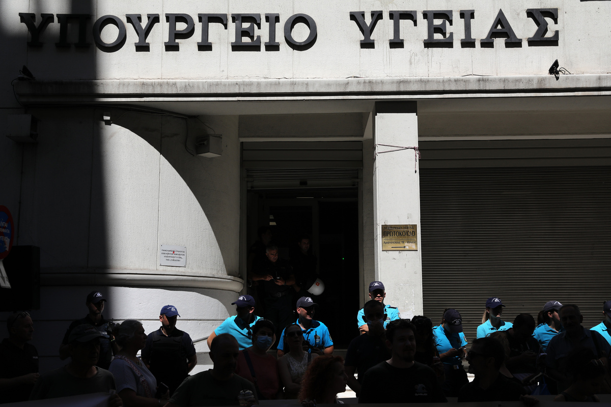Μέλη της Ομοσπονδίας Ενώσεων Νοσοκομειακών Γιατρών Ελλάδας (ΟΕΝΓΕ) και της Ένωσης Ιατρών Νοσοκομείων Αθήνας - Πειραιά (ΕΙΝΑΠ) πραγματοποιούν απεργιακή συγκέντρωση διαμαρτυρίας στο υπουργείο Υγείας, Αθήνα, Τρίτη 16 Ιουλίου 2024. ΑΠΕ-ΜΠΕ/ΑΠΕ-ΜΠΕ/ ΓΙΩΡΓΟΣ ΒΙΤΣΑΡΑΣ