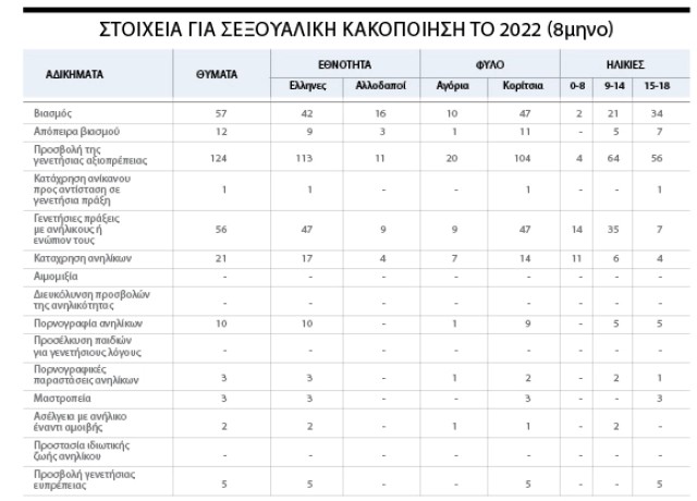 Συγκεκριμένα, το πρώτο οκτάμηνο του 2022, ήτοι έως τα τέλη Αυγούστου, έχουν καταγραφεί 257 υποθέσεις με 294 ανήλικα θύματα, εκ των οποίων τα 244 είναι κορίτσια και τα 50 αγόρια.