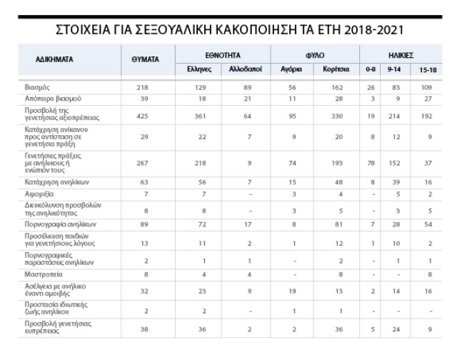 Από βρέφη λίγων ημερών και παιδιά του Δημοτικού μέχρι ανήλικους λίγο πριν την ενηλικίωσή τους. Συγκεκριμένα, το 2018 καταγράφονται 247 υποθέσεις με 278 ανήλικα θύματα, το 2019 252 υποθέσεις με 294 θύματα και το 2020 πέρασαν στα αρχεία των αρμόδιων υπηρεσιών της Αστυνομίας 244 υποθέσεις με 342 θύματα.