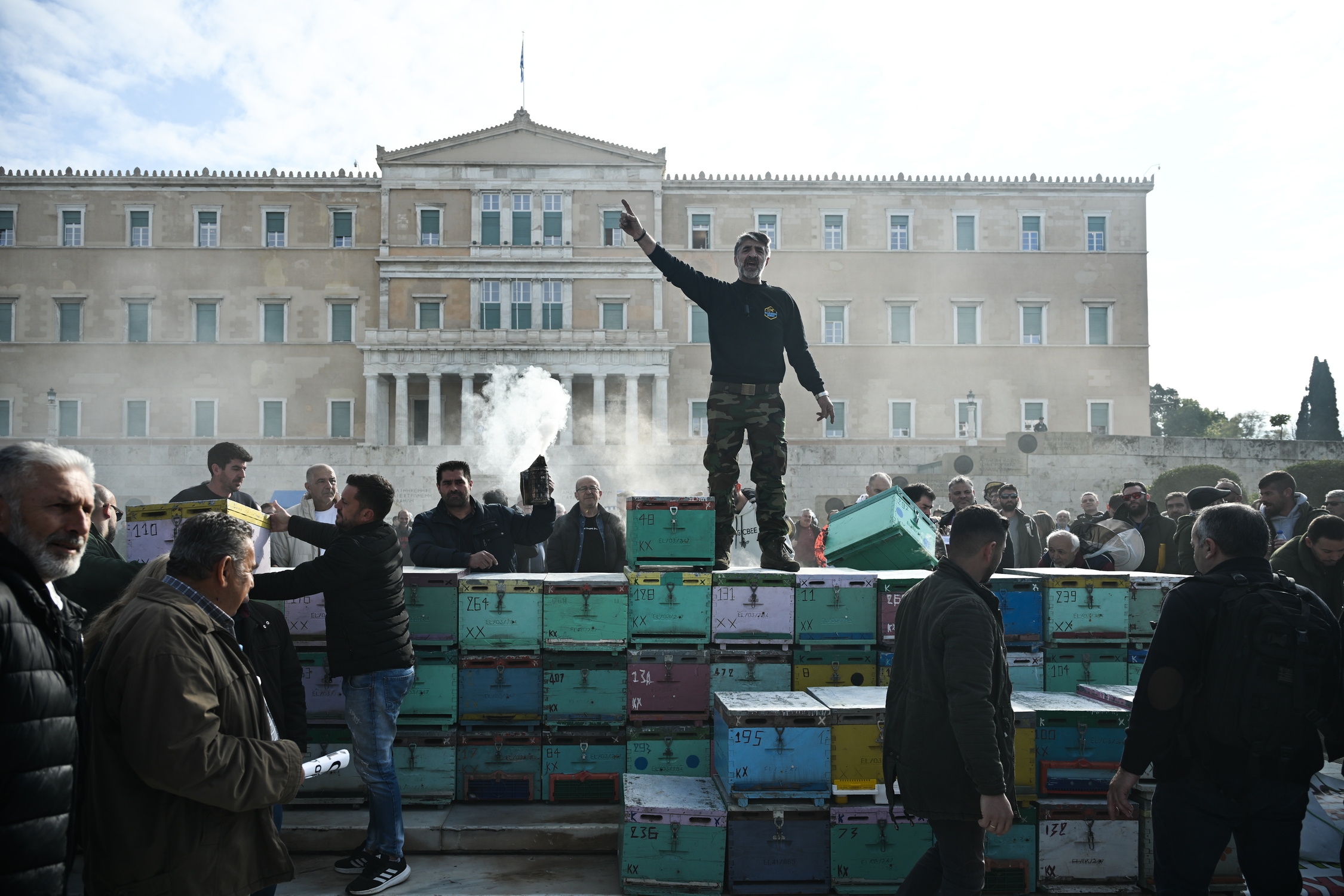 Beekeepers at Synyagma square during a protest in Athens, Greece, on February 22, 2024. / Μελισσοκόμοι στο Σύνταγμα στα πλαίσια διαμαρτυρίας, στις 22 Φεβρουαρίου 2024