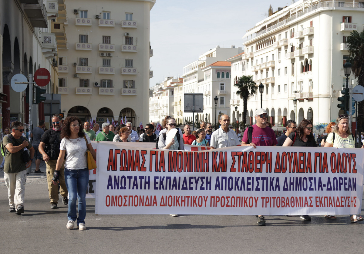 Μέλη συνδικαλιστικών οργανώσεων συμμετέχουν σε απεργιακή συγκέντρωση στο Άγαλμα Βενιζέλου στη Θεσσαλονίκη, στο πλαίσιο 24ωρης πανελλαδικής απεργίας, Πέμπτη 21 Σεπτεμβρίου 2023. Συνδικάτα εργαζομένων του ιδιωτικού και του δημοσίου τομέα συμμετέχουν σε 24ωρη πανελλαδική απεργία αντιδρώντας στο εργασιακό νομοσχέδιο της κυβέρνησης το οποίο συζητείται σήμερα στην Ολομέλεια της Βουλής. ΑΠΕ-ΜΠΕ/ΑΠΕ-ΜΠΕ/ΝΙΚΟΣ ΑΡΒΑΝΙΤΙΔΗΣ