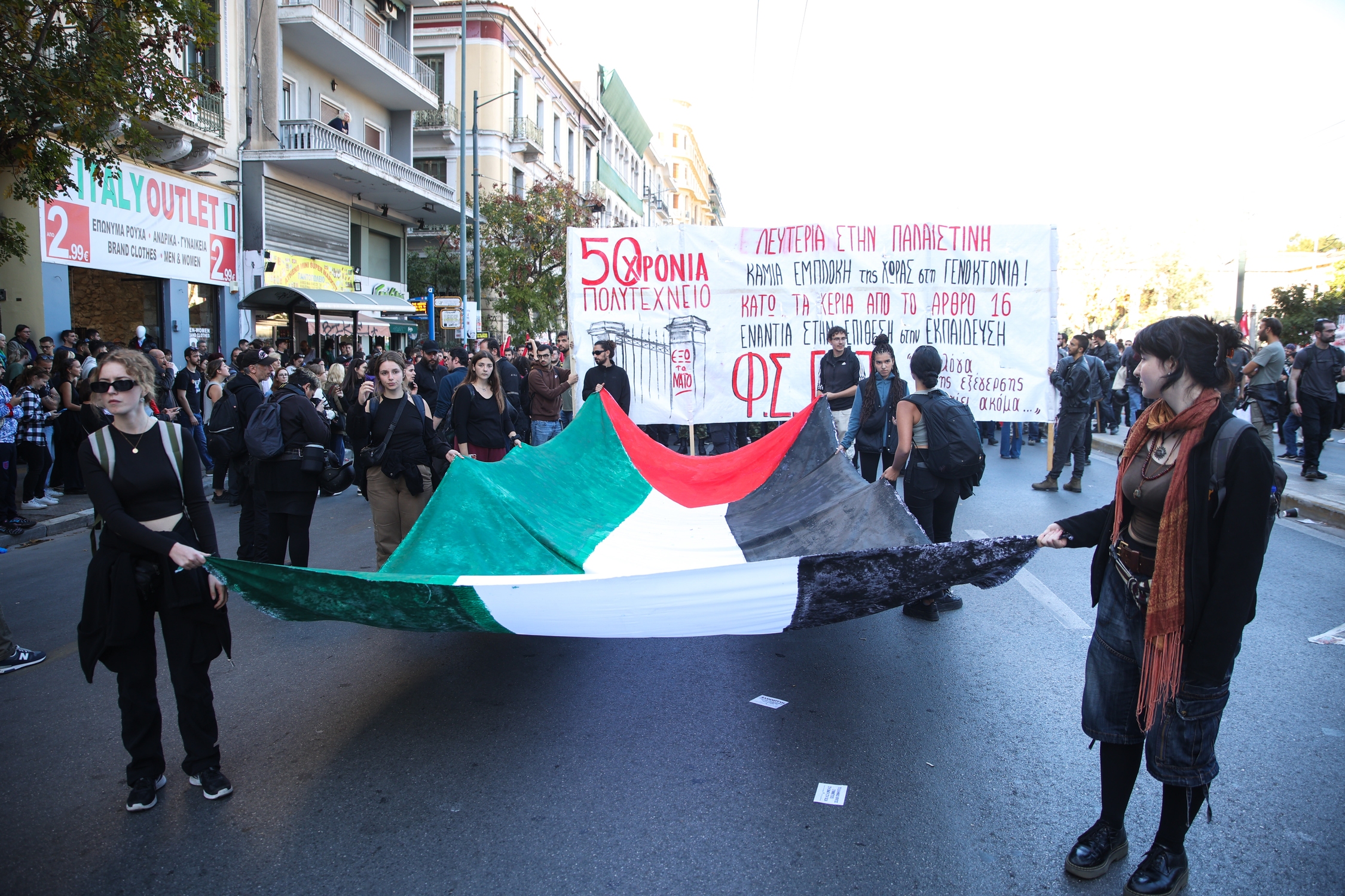 Σε εξέλιξη βρίσκεται η πορεία για τα 50 χρόνια από την εξέγερση του Πολυτεχνείου, με την αιματοβαμμένη σημαία από την εξέγερση να προπορεύεται στην κεφαλή της πορείας.