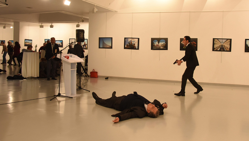 epa05682748 Gunman (R) clutching a pistol stands near slain Russia's ambassador to Turkey, Andrey Karlov's body (down), after he shot him during an art exhibition in Ankara, Turkey, 19 December 2016. Russia's ambassador to Turkey, Andrey Karlov, has been shot at an art exhibition in the Turkish capital of Ankara. Karlov has died of his wounds after the attack, Russia's Ministry of Foreign Affairs confirmed. EPA/SOZCU NEWSPAPER VIA DEPO PHOTOS TURKEY OUT