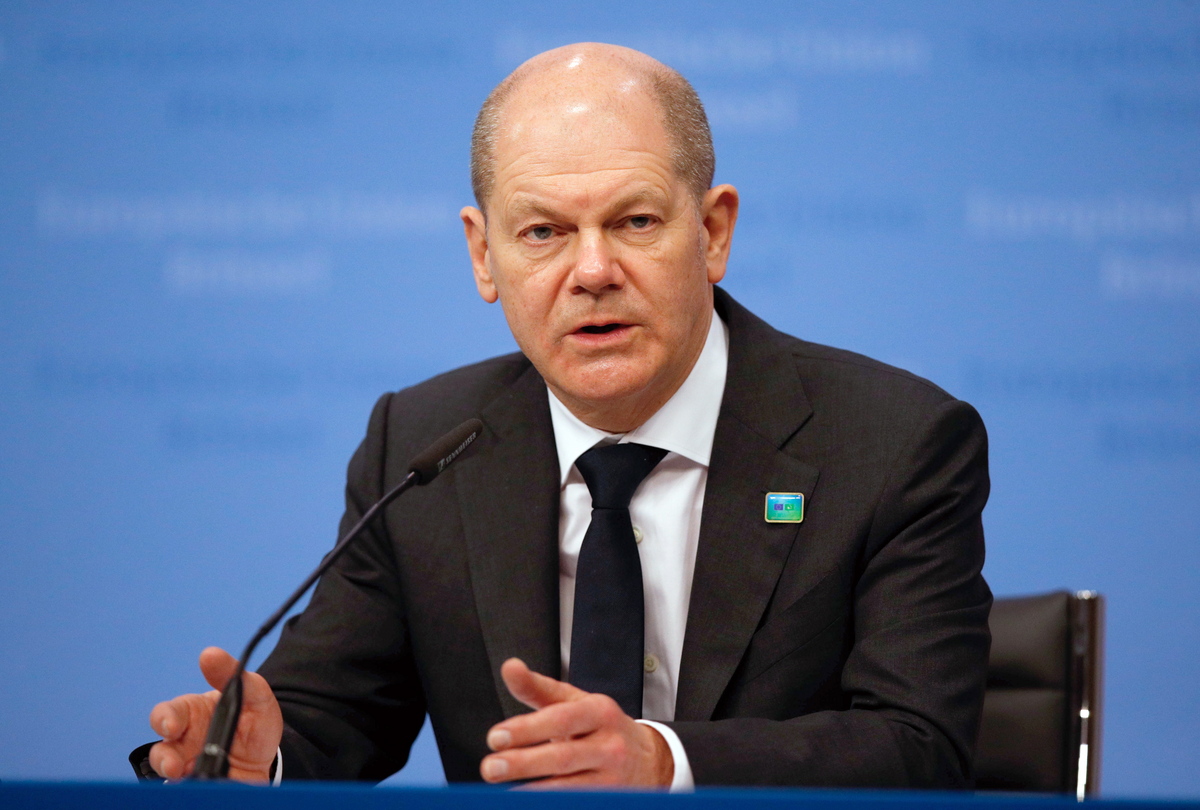 epa09769278 German Chancellor Olaf Scholtz holds a news conference during European Union - African Union summit, in Brussels, Belgium, 18 February 2022. EPA/JOHANNA GERON / POOL