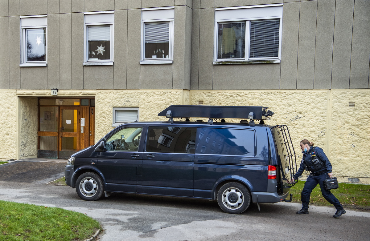 epa08854178 Police technicians examine an apartment in Haninge, Sweden, 01 December 2020. On the evening of 29 November, a man in his 40s was found in an apartment in Haninge municipality in Stockholm. He is suspected of having been imprisoned for 28 years by his mother. EPA/Claudio Bresciani SWEDEN OUT
