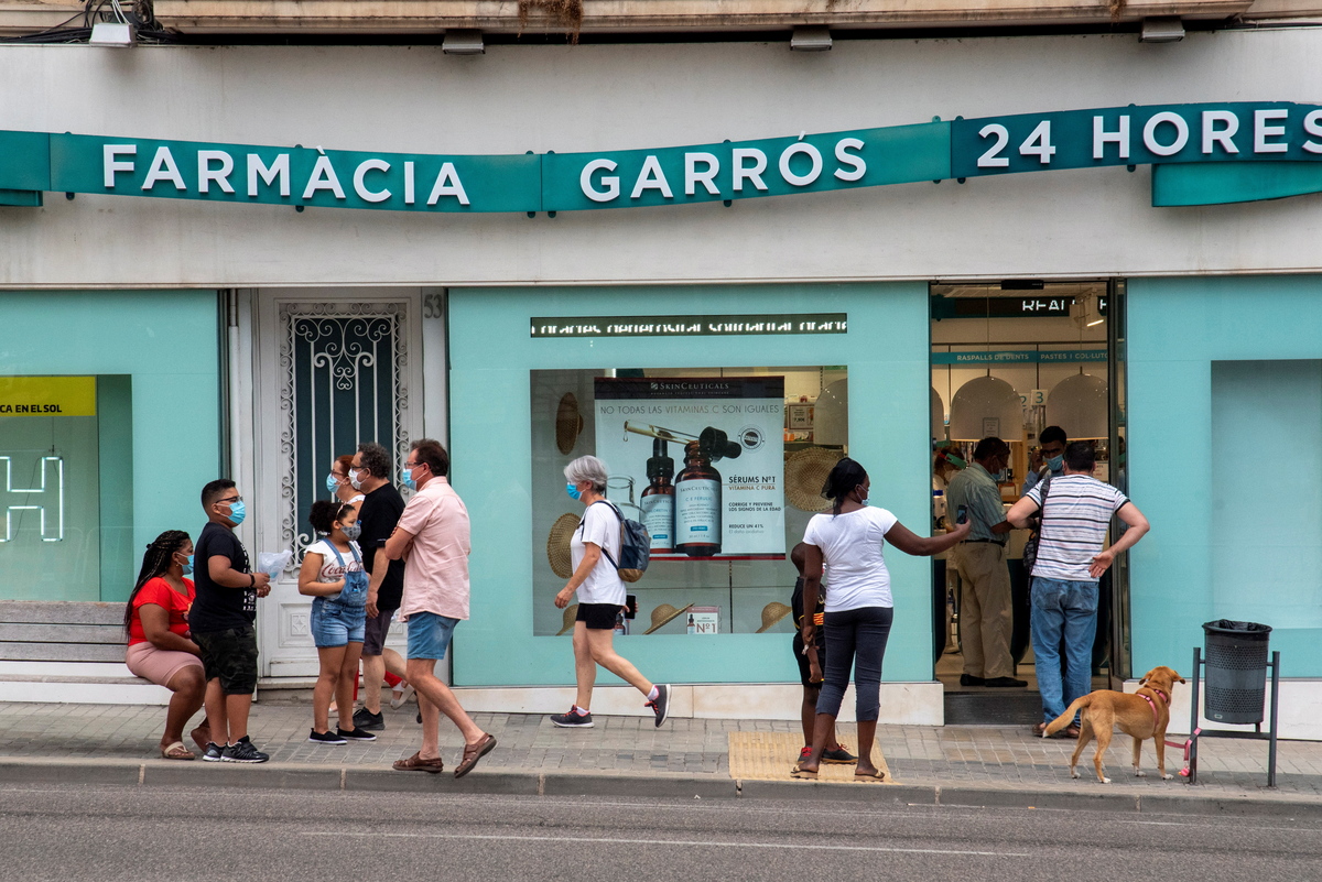 epa08542410 People queue at a 24-hours pharmacy in Lleida, Catalonia, Spain, 12 July 2020. The Catalonian regional government decided that Lleida and seven more villages of the region of Segria will be on partial lockdown ordered to flatten the curve of the ongoing coronavirus pandemic. Catalonia has declared 816 new cases this Sunday. EPA/Ramon Gabriel