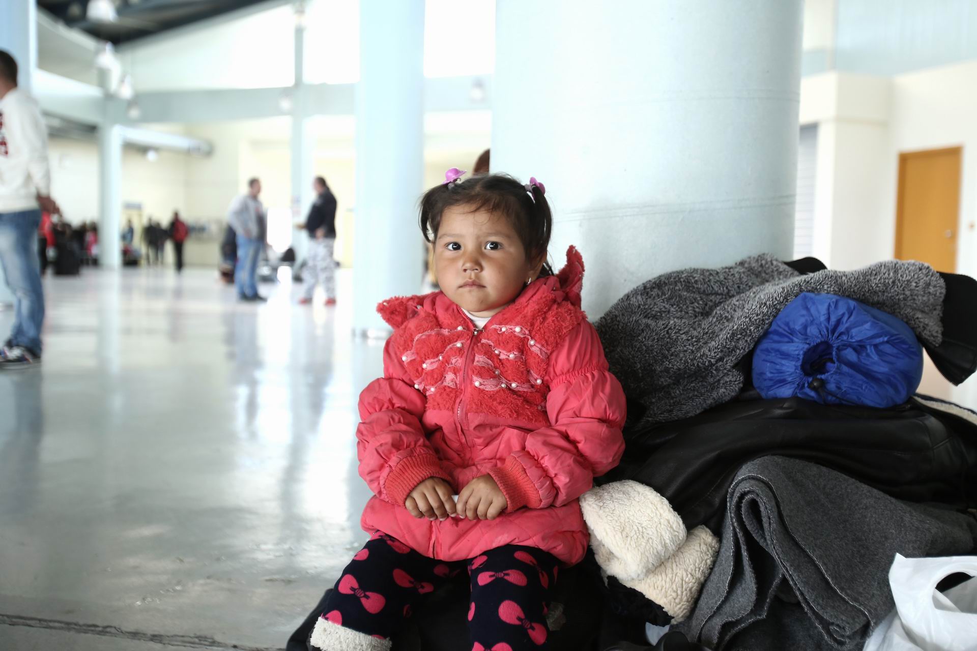 Μικρό κορίτσι κάθεται δίπλα σε ρούχα και κουβέρτες, στον τερματικό σταθμό του Πειραιά. Τρεις χιλιάδες μετανάστες και πρόσφυγες κατέπλευσαν στο λιμάνι του Πειραιά, προερχόμενοι από τη Μυτιλήνη και τη Χίο. Η μεταφορά έγινε με δύο επιβατηγά πλοία, μετά τη λήξη της απεργίας της Πανελλήνιας Ναυτικής Ομοσπονδίας. Λόγω της απεργίας, εφτά χιλιάδες άνθρωποι από την Ασία, ενώ έχουν λάβει έγγραφα ταυτοποίησης, έχουν εγκλωβιστεί στο λιμάνι της Μυτιλήνης. Παρασκευή 6 Νοεμβρίου 2015.