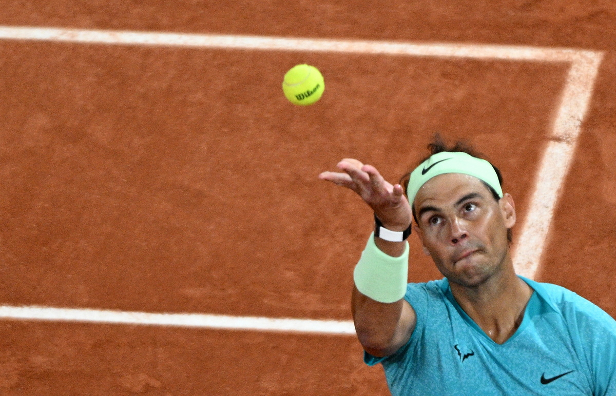 epa11374173 Rafael Nadal of Spain in action during his Men's Singles 1st round match against Alexander Zverev of Germany during the French Open Grand Slam tennis tournament at Roland Garros in Paris, France, 27 May 2024. EPA/CAROLINE BLUMBERG