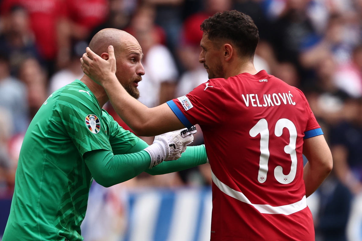 epa11425134 Goalkeeper Predrag Rajkovic of Serbia (L) talks with his teammate Milos Veljkovic the UEFA EURO 2024 Group C soccer match between Slovenia and Serbia, in Munich, Germany, 20June 2024. EPA/ANNA SZILAGYI