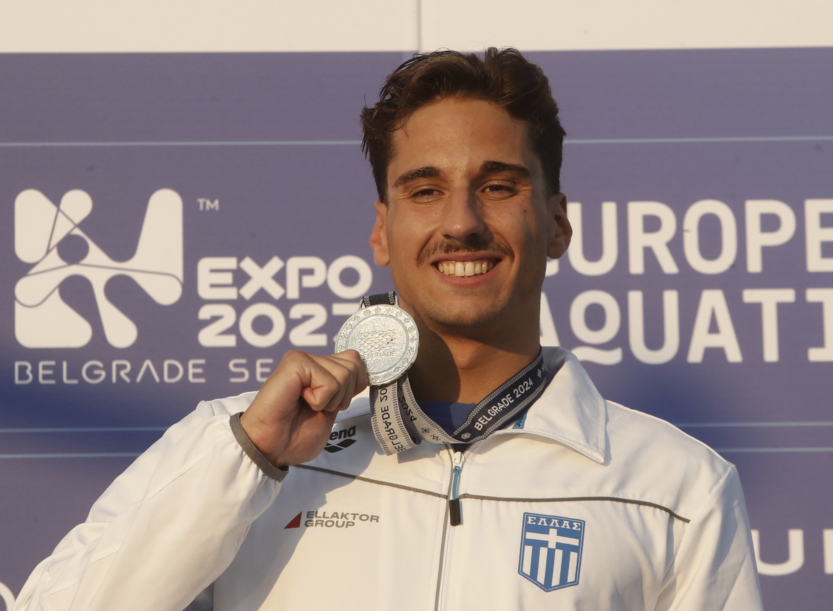 epa11420663 Gold medal winner Stergios Marios Bilas of Greece poses with his medal during the podium ceremony for the Men's 50m Butterfly Final race at the European Aquatics Championships Belgrade 2024, in Belgrade, Serbia, 18 June 2024. EPA/ANTONIO BAT