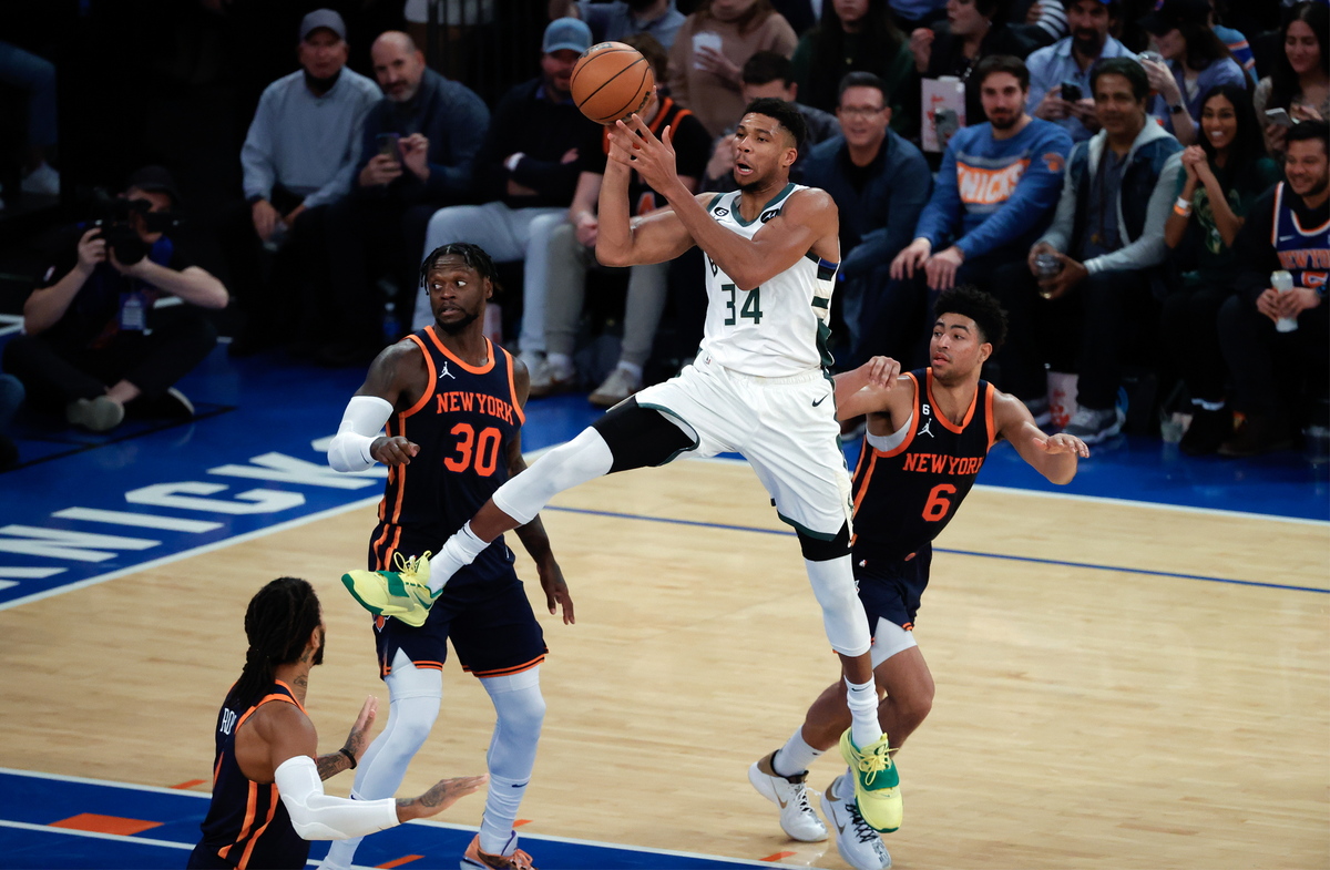epaselect epa10340492 Milwaukee Bucks forward Giannis Antetokounmpo of Greece (C) in action against the New York Knicks defense in the first half of the NBA basketball game between the Milwaukee Bucks and the New York Knicks at Madison Square Garden in New York, New York, USA, 30 November 2022. EPA/JASON SZENES SHUTTERSTOCK OUT