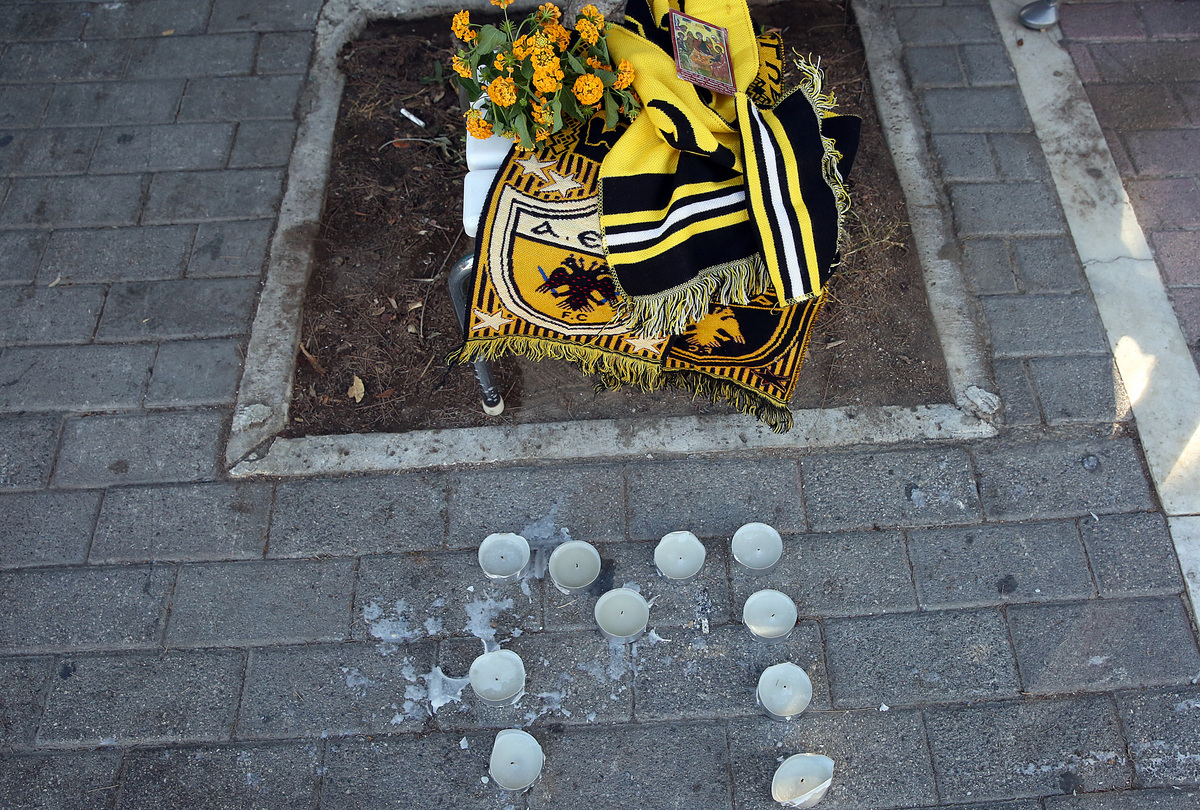 Ένα κασκόλ της ΑΕΚ, λουλούδια και κεριά που σχηματίζουν το γράμμα Μ υποδεικνύουν το σημείο όπου ομάδα περίπου 100-120 οπαδών της Dinamo Zagreb και Έλληνες οπαδοί-συνεργοί τους επιτέθηκαν εναντίον οπαδών της ΑΕΚ, δίπλα στο γήπεδο της ομάδας τους στη Νέα Φιλαδέλφεια, Τρίτη 8 Αυγούστου 2023. Ο 29χρονος οπαδός της ΑΕΚ Μιχάλης Κατσουρής, έχασε τη ζωή του ως αποτέλεσμα της συμπλοκής, ενώ 8 τραυματίες, τρεις Έλληνες και πέντε Κροάτες, νοσηλεύονται σε νοσοκομείο. Αιματηρά επεισόδια προκλήθηκαν χθες τη νύχτα από οπαδούς της Dinamo Zagreb που επιτέθηκαν σε οπαδούς της ΑΕΚ στη Νέα Φιλαδέλφεια. Τα επεισόδια ξεκίνησαν μιάμιση ώρα μετά την ολοκλήρωση της προπόνησης της Dinamo Zagreb και της αποχώρησής της από το γήπεδο, ενόψει του σημερινού αγώνα με την ομάδα της ΑΕΚ, ο οποίος τελικά αναβλήθηκε. Η αστυνομία προέβη σε συλλήψεις 98 ατόμων ενώ προανάκριση διενεργεί η Διεύθυνση Ασφάλειας Αττικής για τον εντοπισμό επιπλέον δραστών. ΑΠΕ-ΜΠΕ/ΑΠΕ-ΜΠΕ/ΟΡΕΣΤΗΣ ΠΑΝΑΓΙΩΤΟΥ