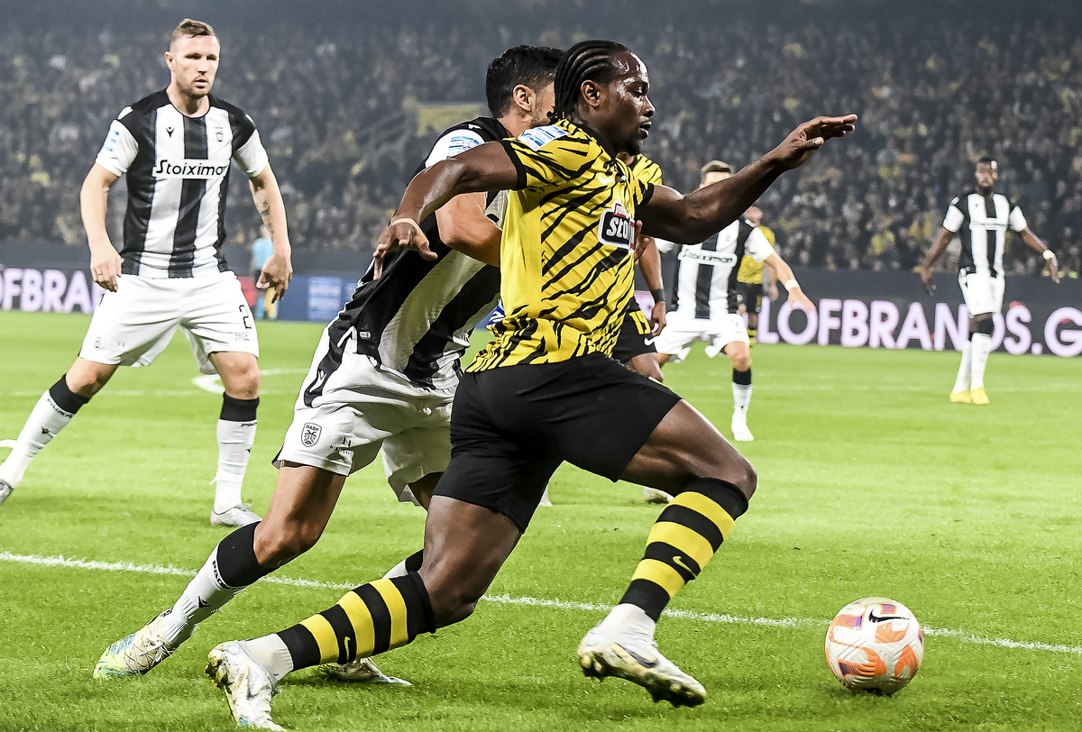 Ο παίκτης της ΑΕΚ (Δ) μάχεται για τη μπάλα με τον παίκτη του ΠΑΟΚ (Κ), κατά τη διάρκεια του αγώνα ΑΕΚ-ΠΑΟΚ για την 10η αγωνιστική του πρωταθλήματος της Super League, στο γήπεδο ΟΠΑΠ Αρένα, την Κυριακή 30 Οκτωβρίου 2022. ΑΠΕ-ΜΠΕ/ΑΠΕ-ΜΠΕ/ΠΑΝΑΓΙΩΤΗΣ ΜΟΣΧΑΝΔΡΕΟΥ